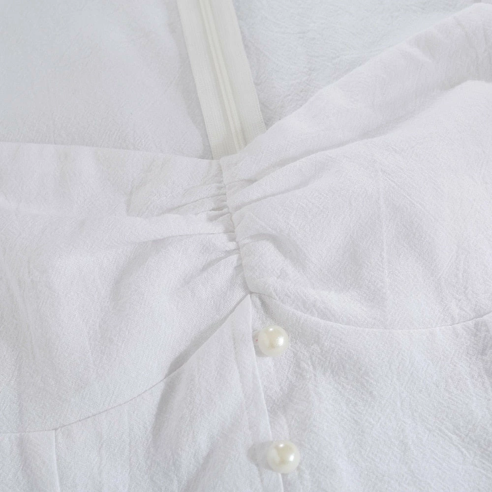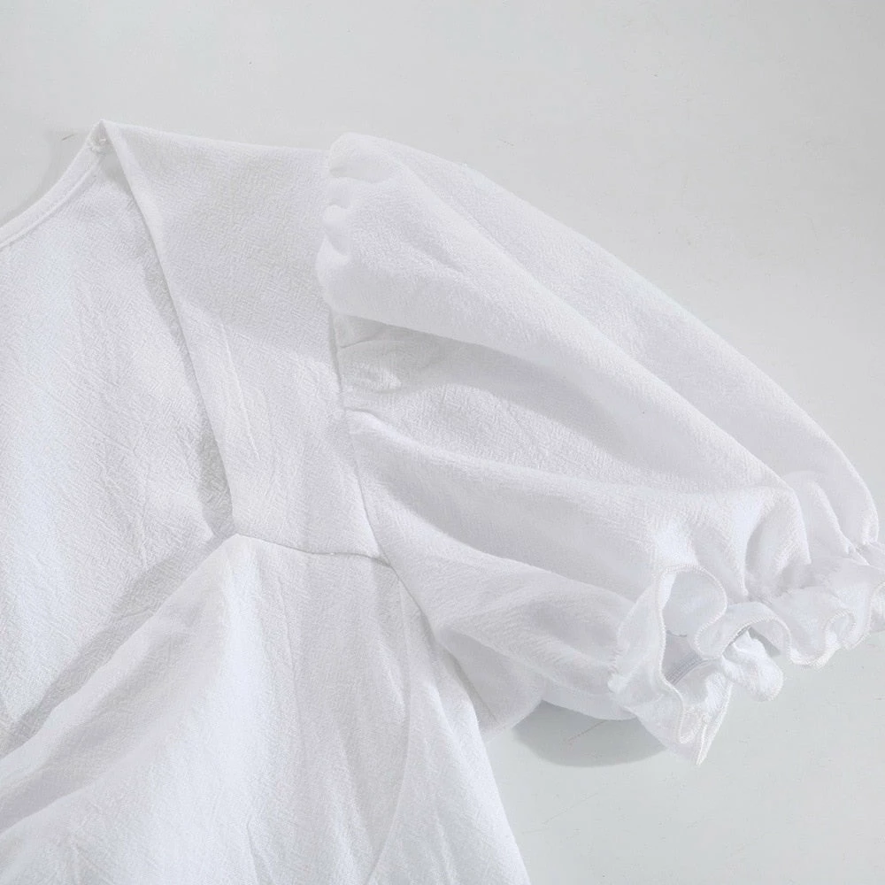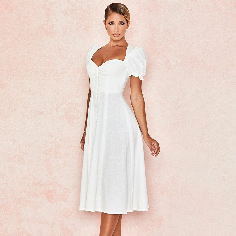 Puff sleeve sundress with a v neckline, mid length fit, and button up front design.
