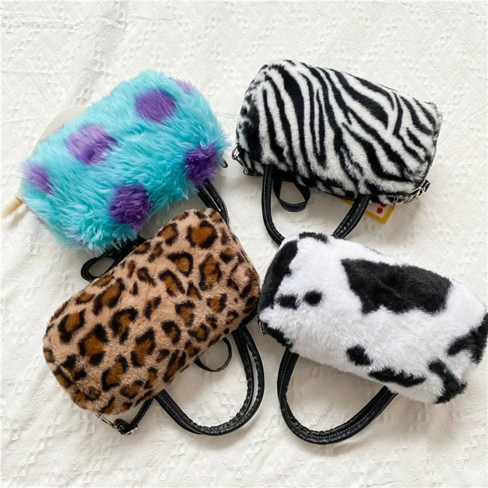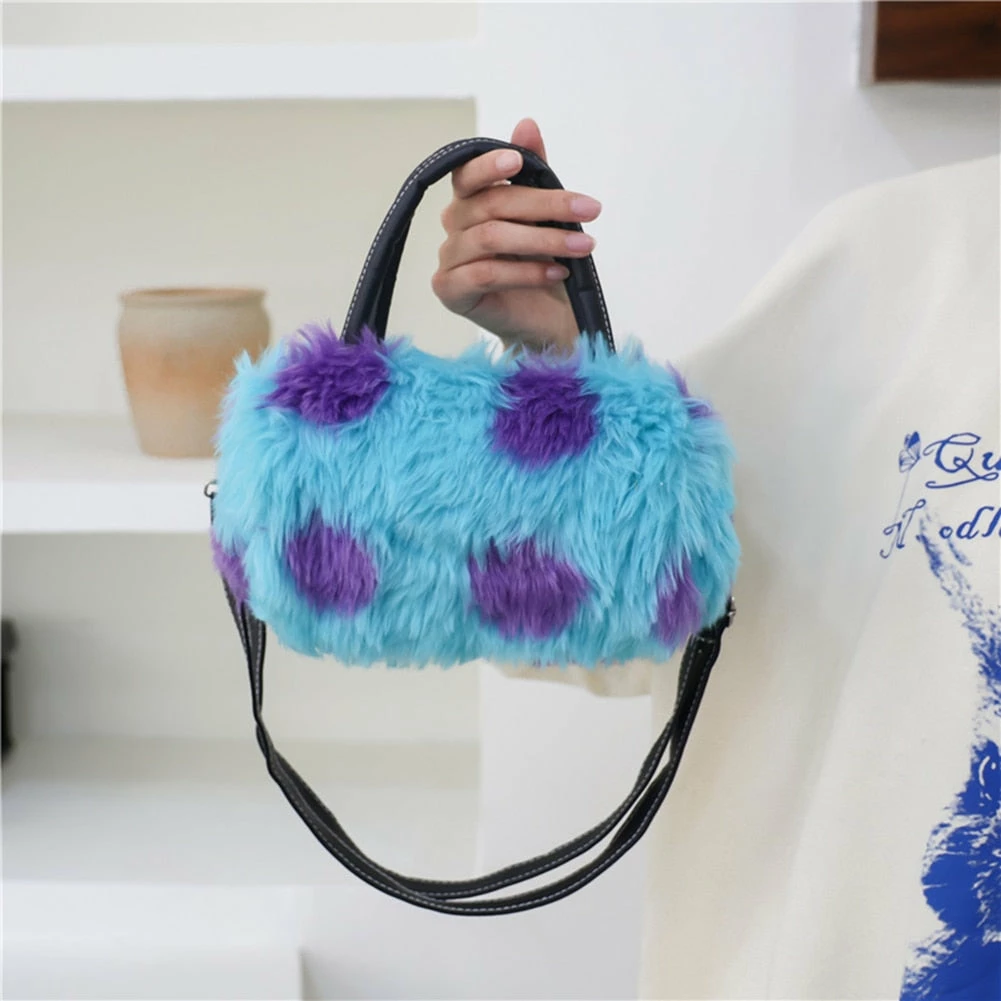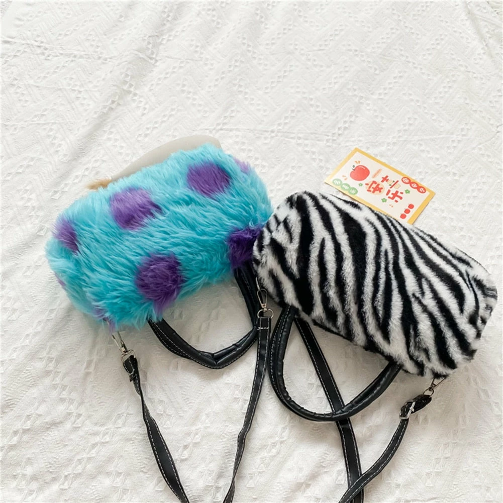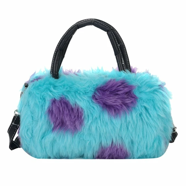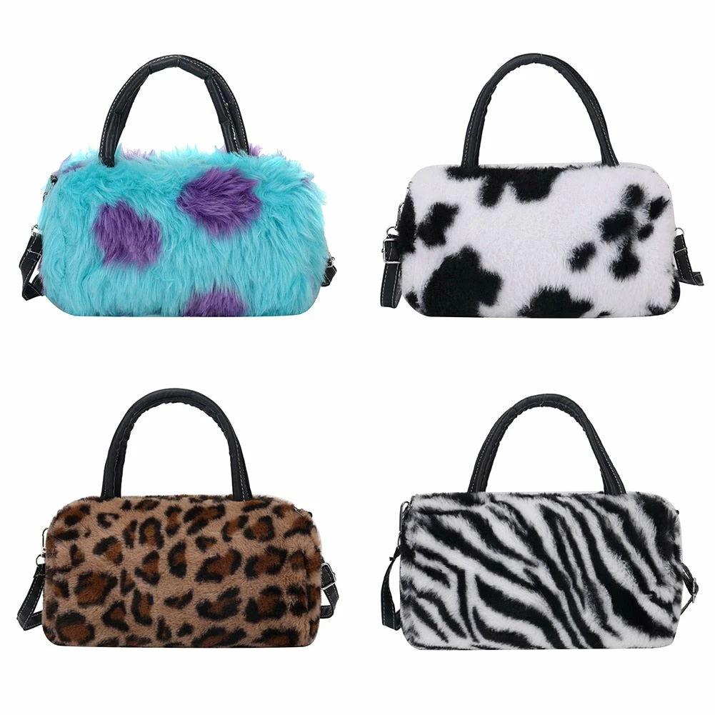 fuzzy fur hand bag with faux vegan leather straps, and removable crossbody strap