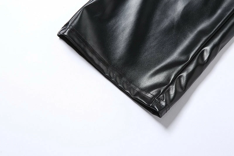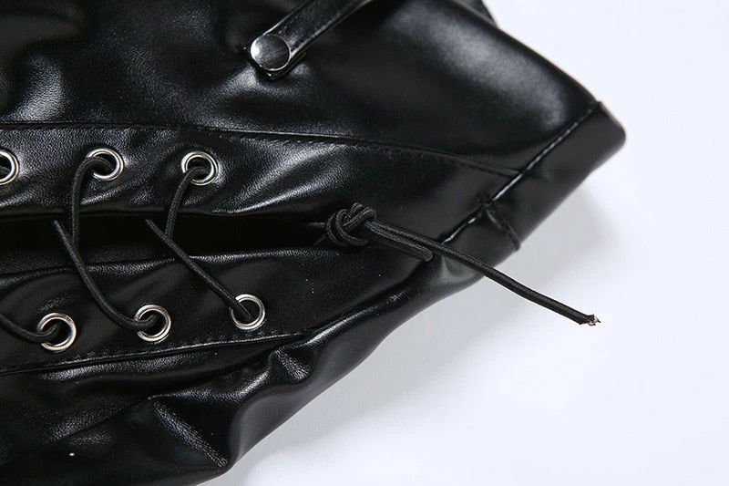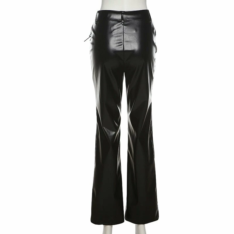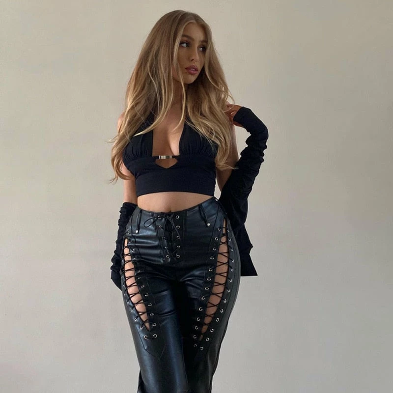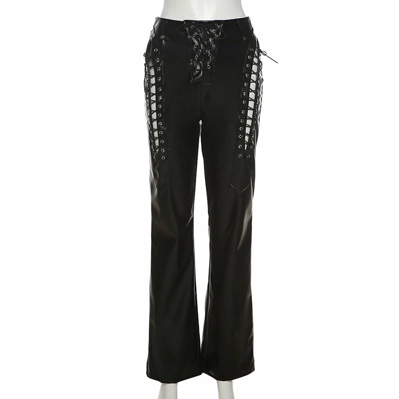 Faux vegan leather high waisted lace up leather pants with a straight leg fit.