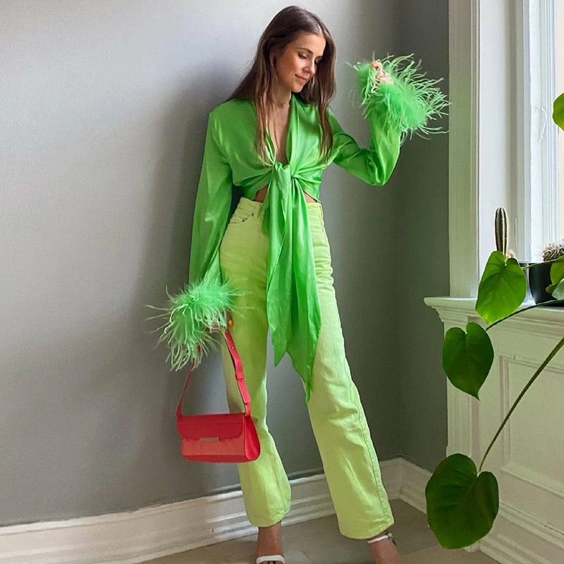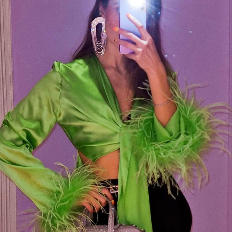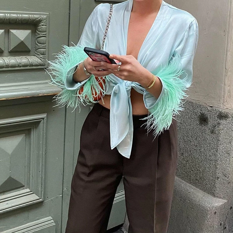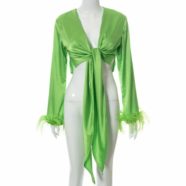 Long sleeve adjustable tie front cropped top with feather detailing… #OBSESSEDDDDDD