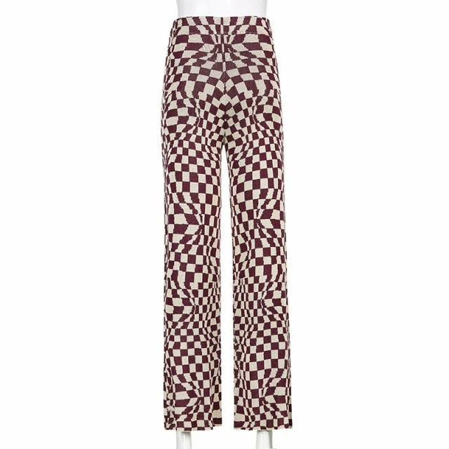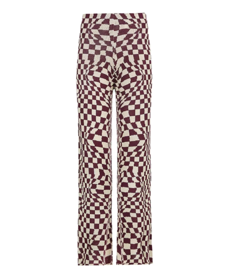 Knitted checkerboard pants with elastic waist band, a straight leg fit.