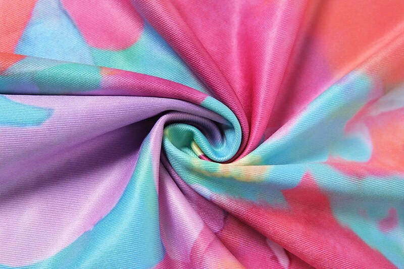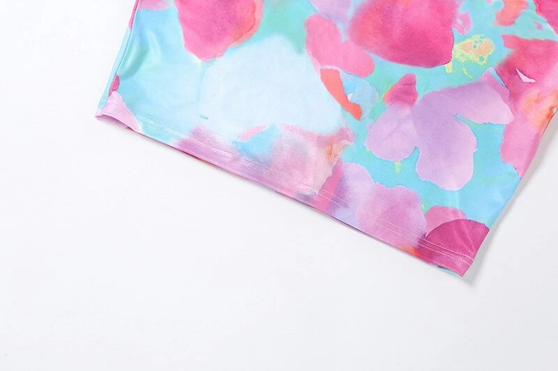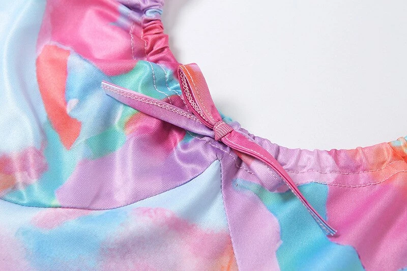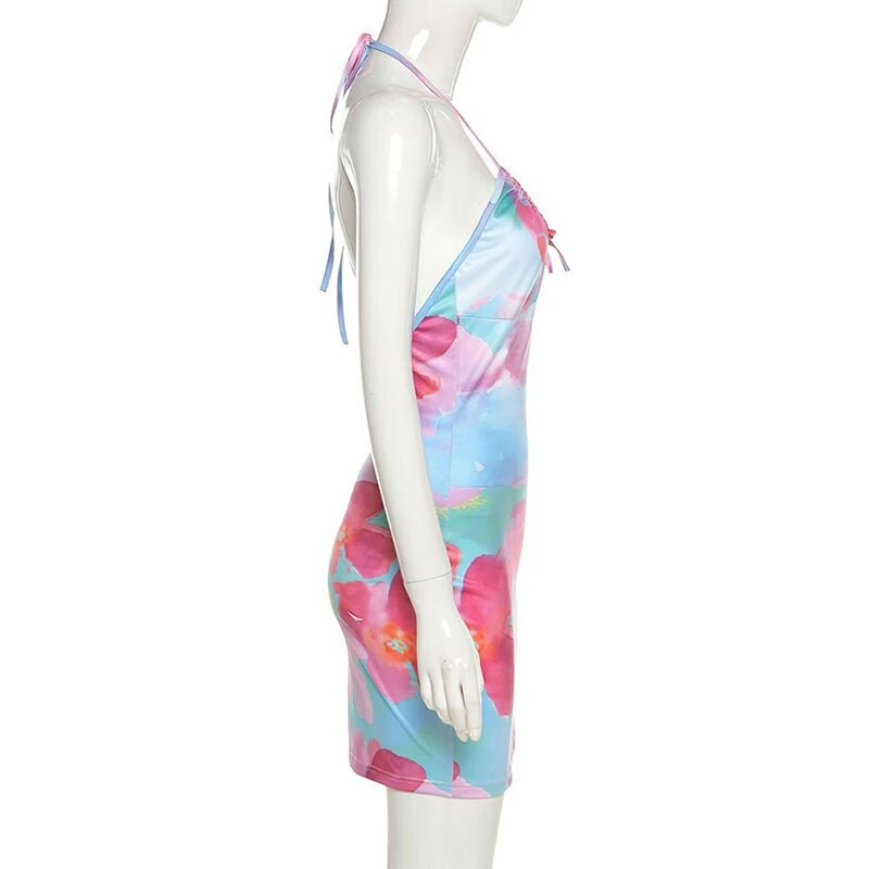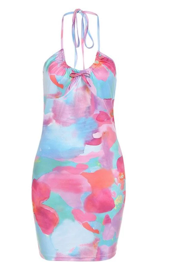 Light & fun colorful mini dress with an adjustable halter top fit, and self tie bow front design. Model wears a a size small.