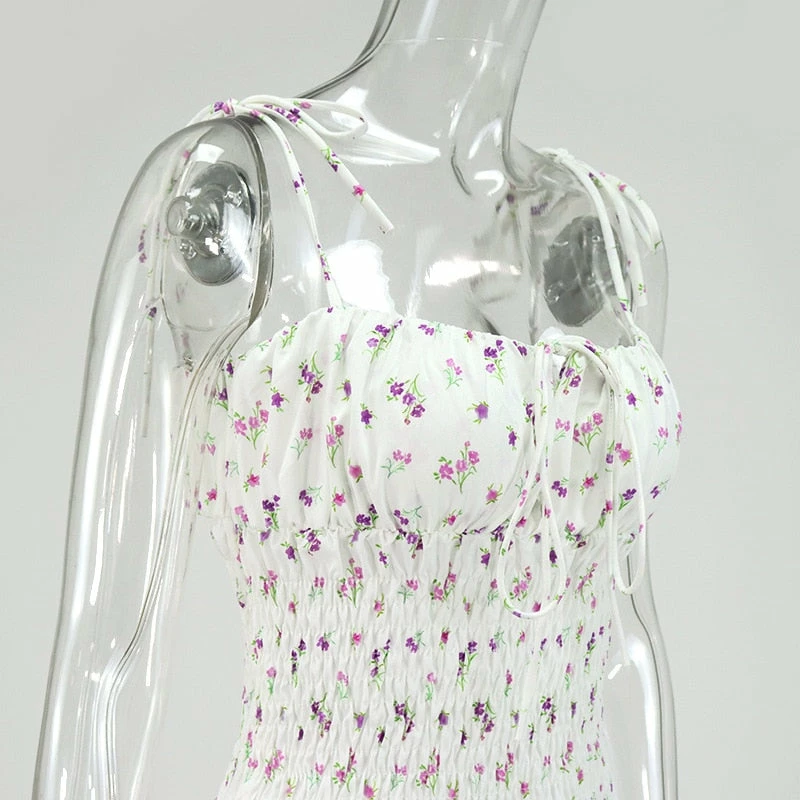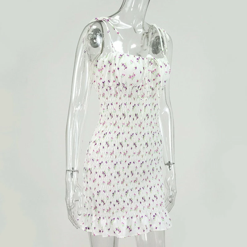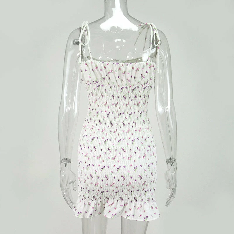 Mini sundress with a dainty floral print, fitted bodycon shape, and adjustable spaghetti straps.