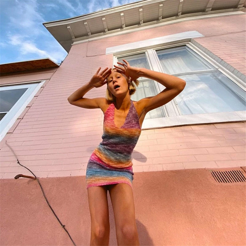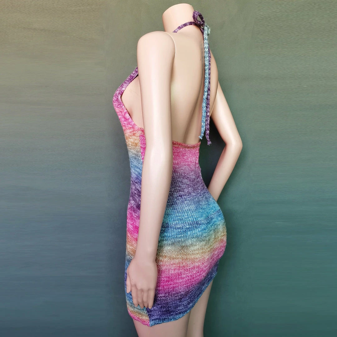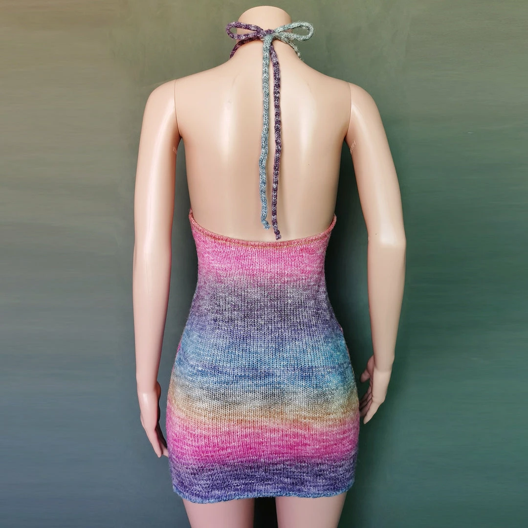 Mini knitted dress with a y2k tie dye design with an adjustable halter tie strap, and plunging v neck.