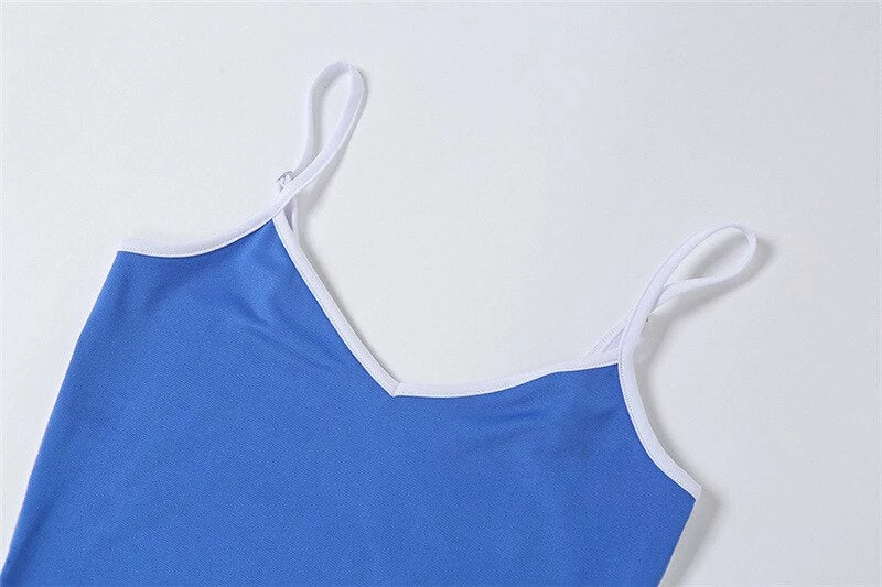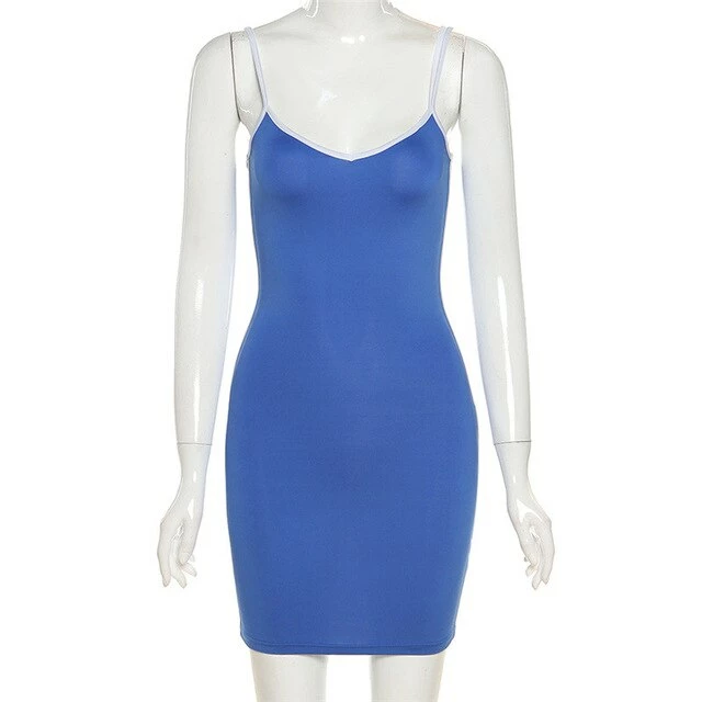 Lightweight fitted mini dress with adjustable spaghetti straps. Model wears a size small