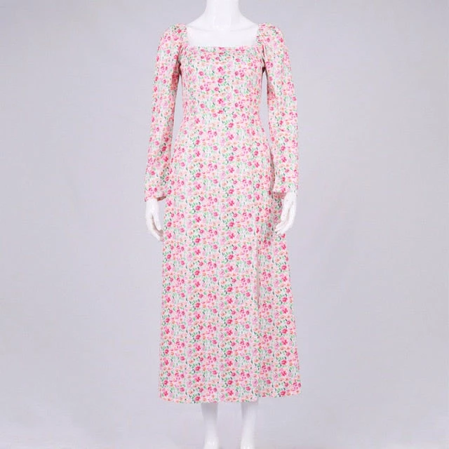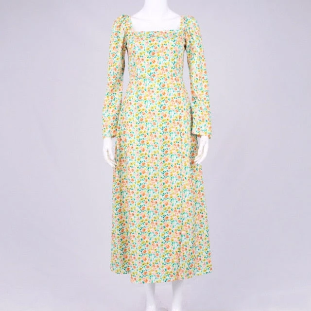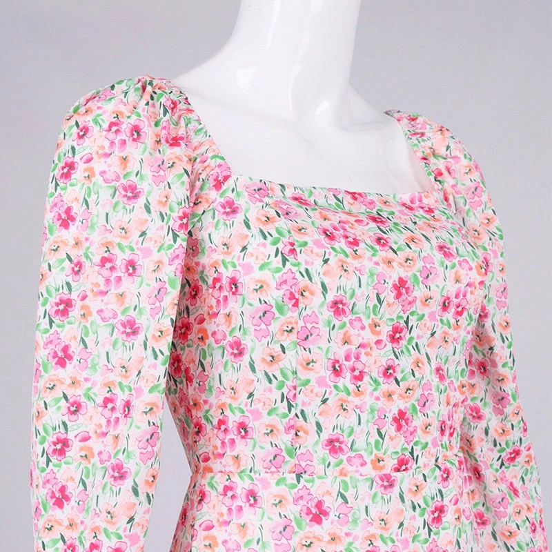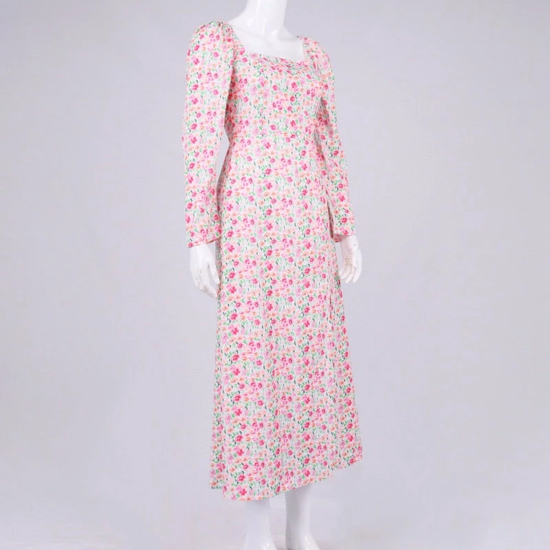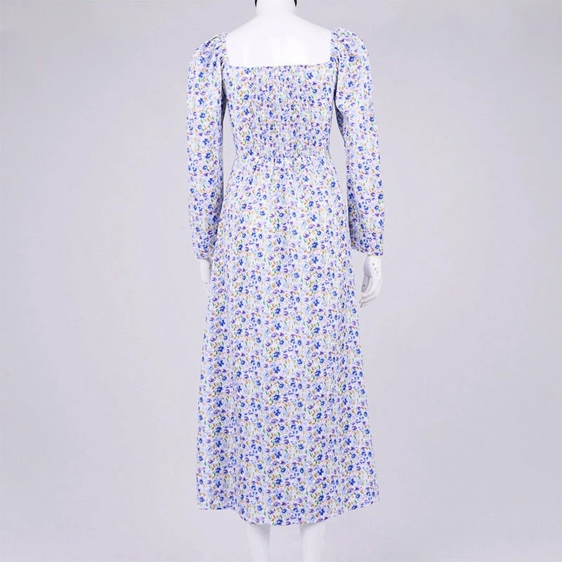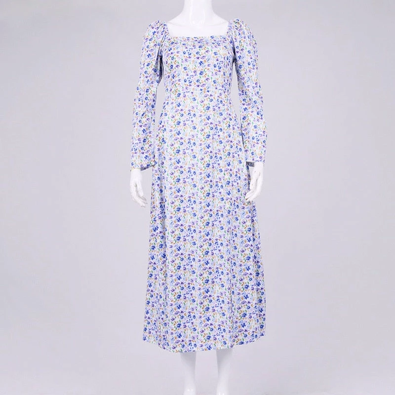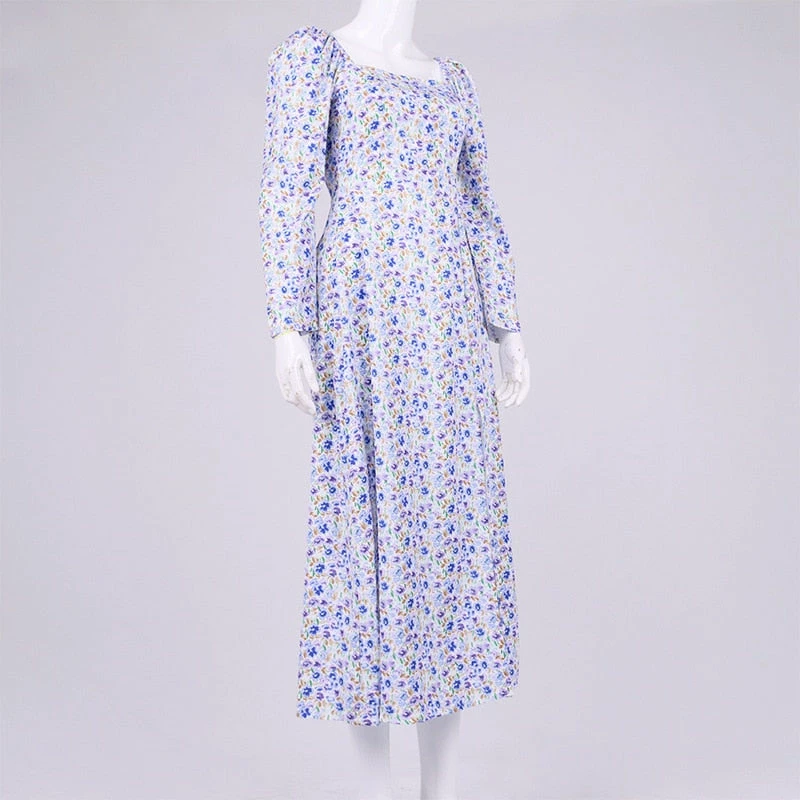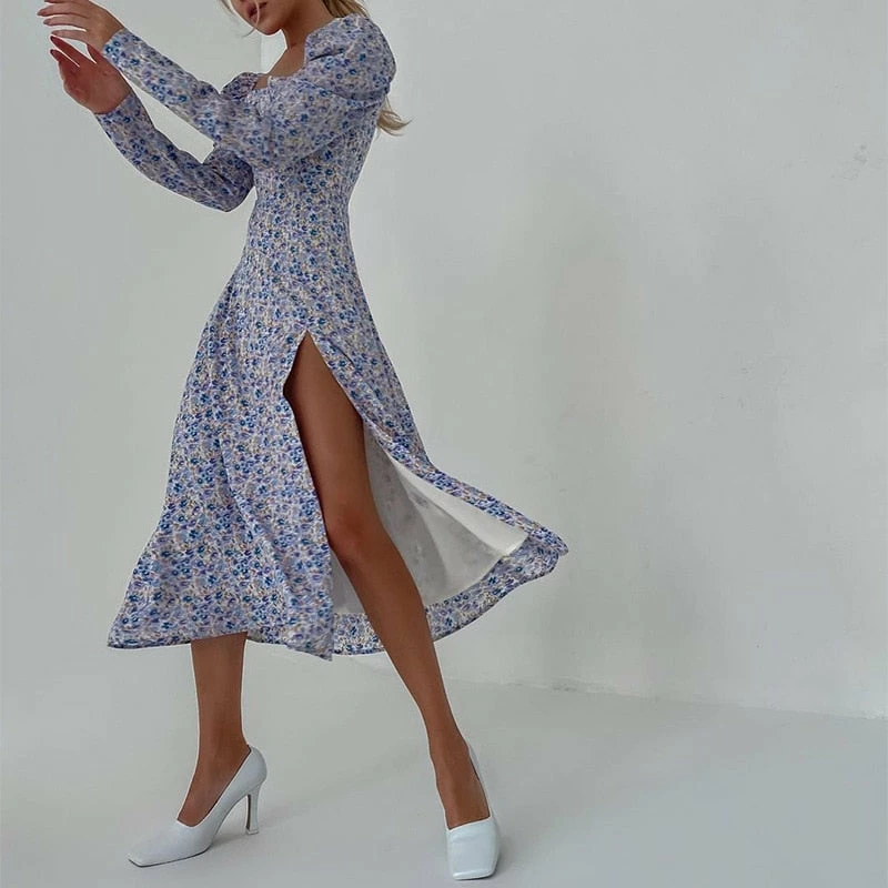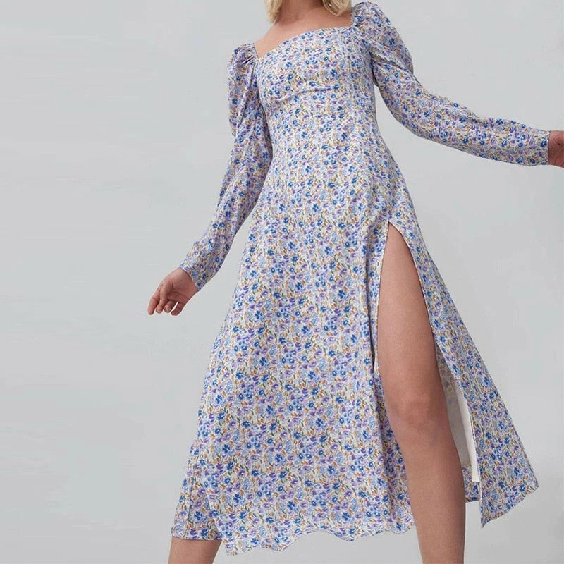 Long puff sleeve sundress with a modest leg slit, and a square neck line.