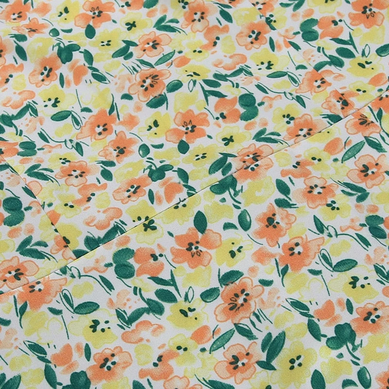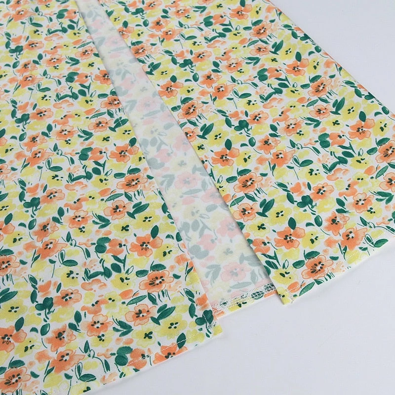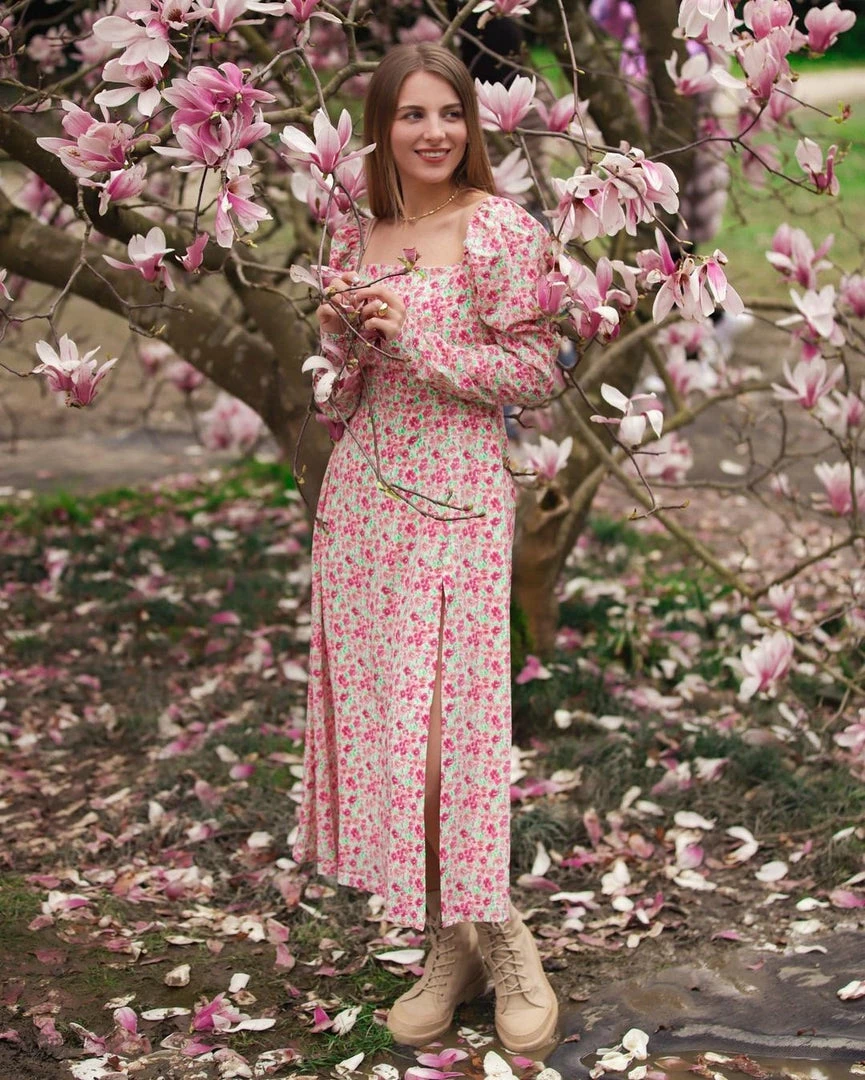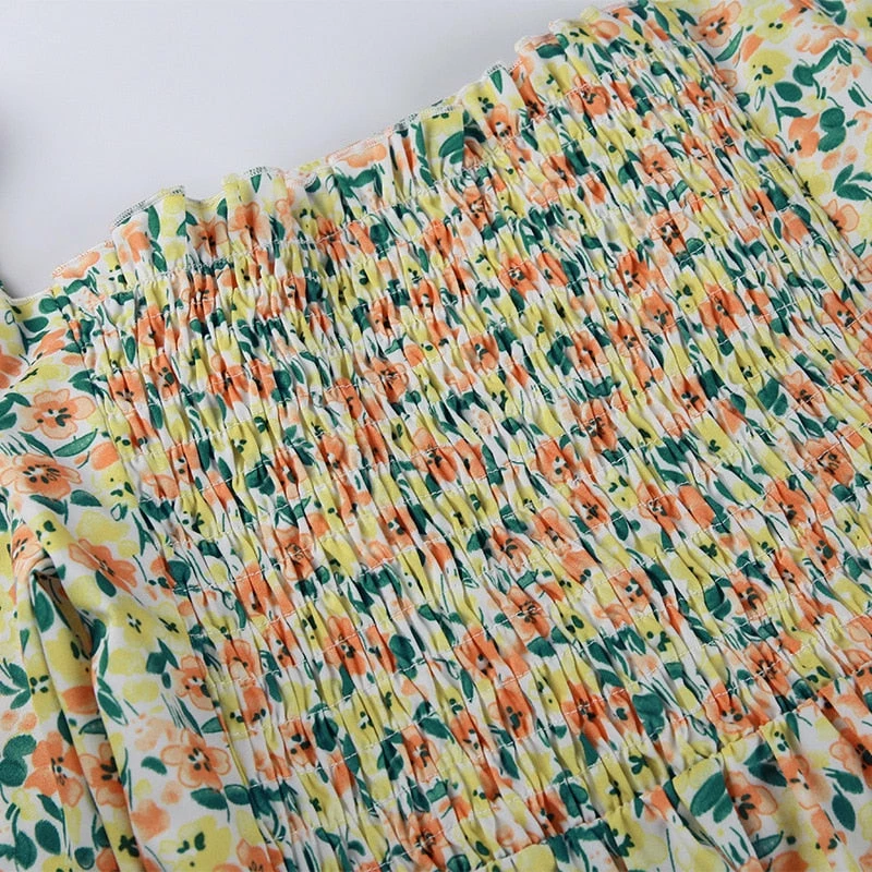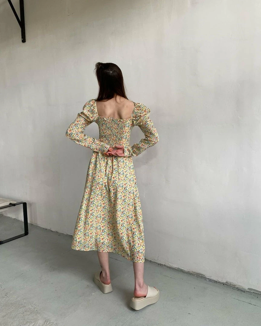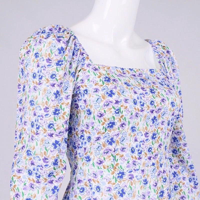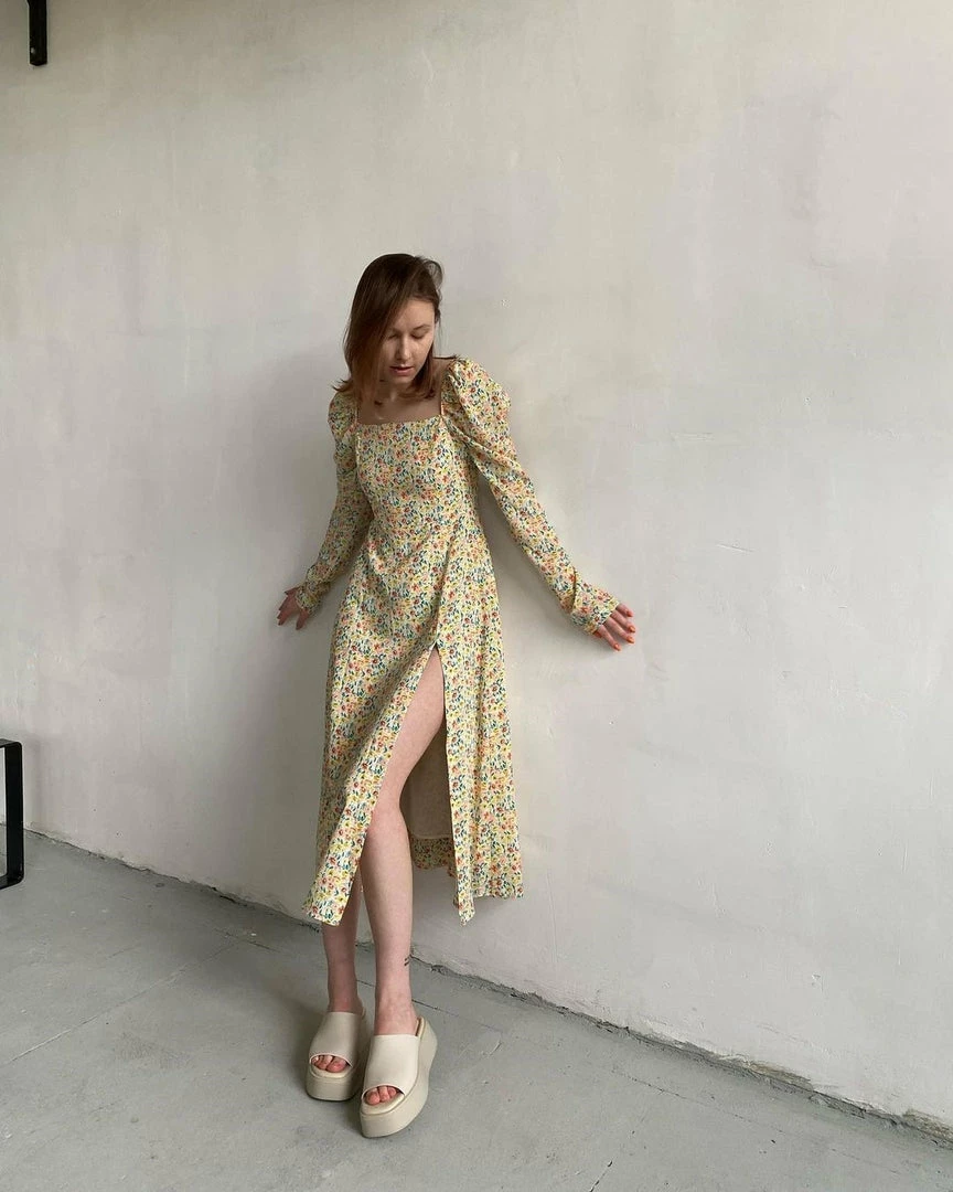 Long puff sleeve sundress with a modest leg slit, and a square neck line.