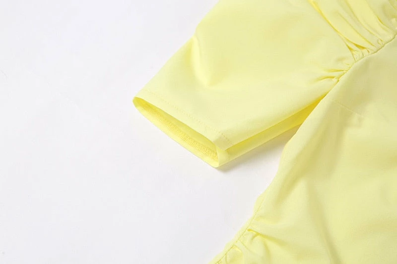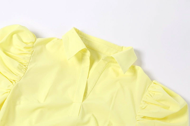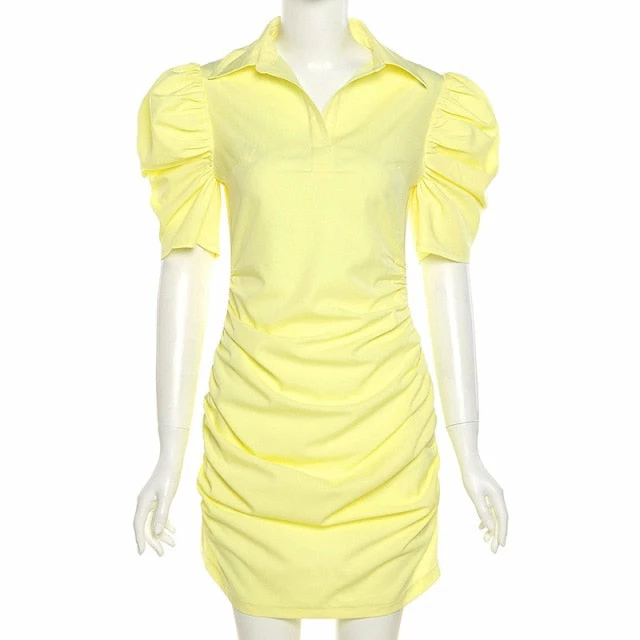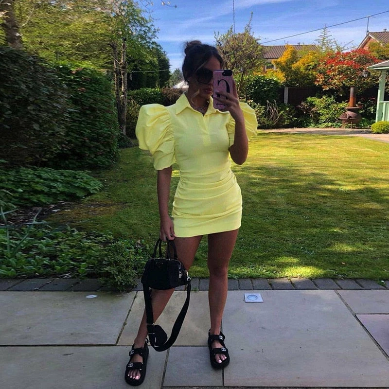 Mini sundress with puff sleeve design, and collared neck.