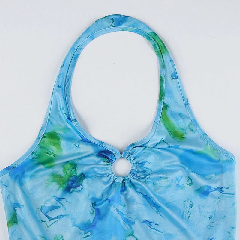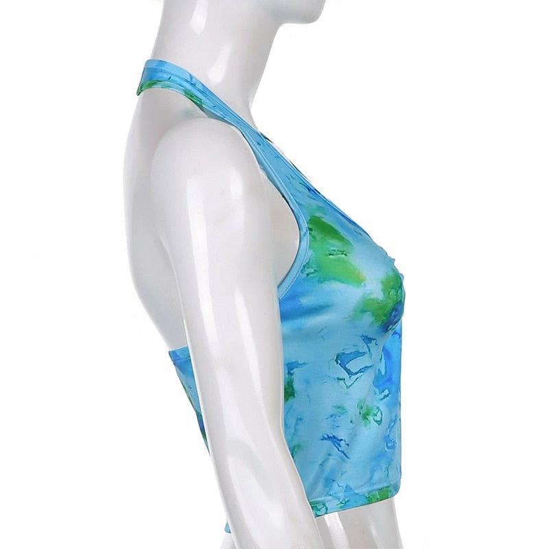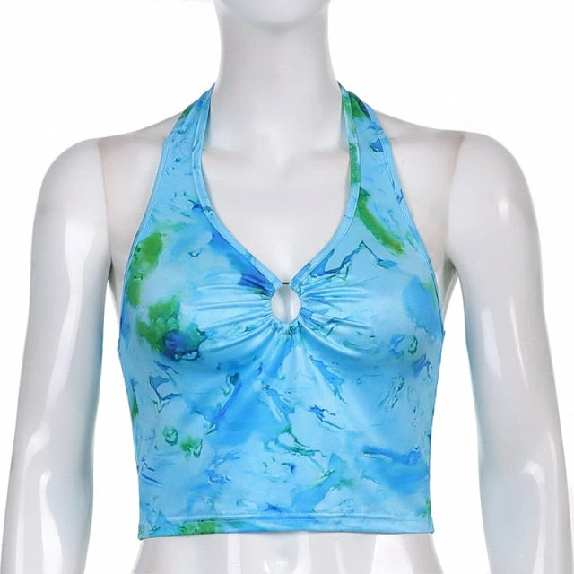 Y2K swirly / tie dye halter top with silver center keyhole detailing. Model wears a size small.