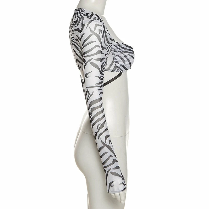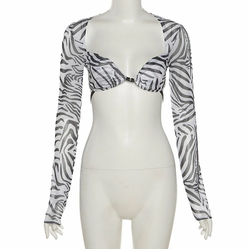 Sheer long sleeve, cropped, underwire detailing, and a scoop front chest design.