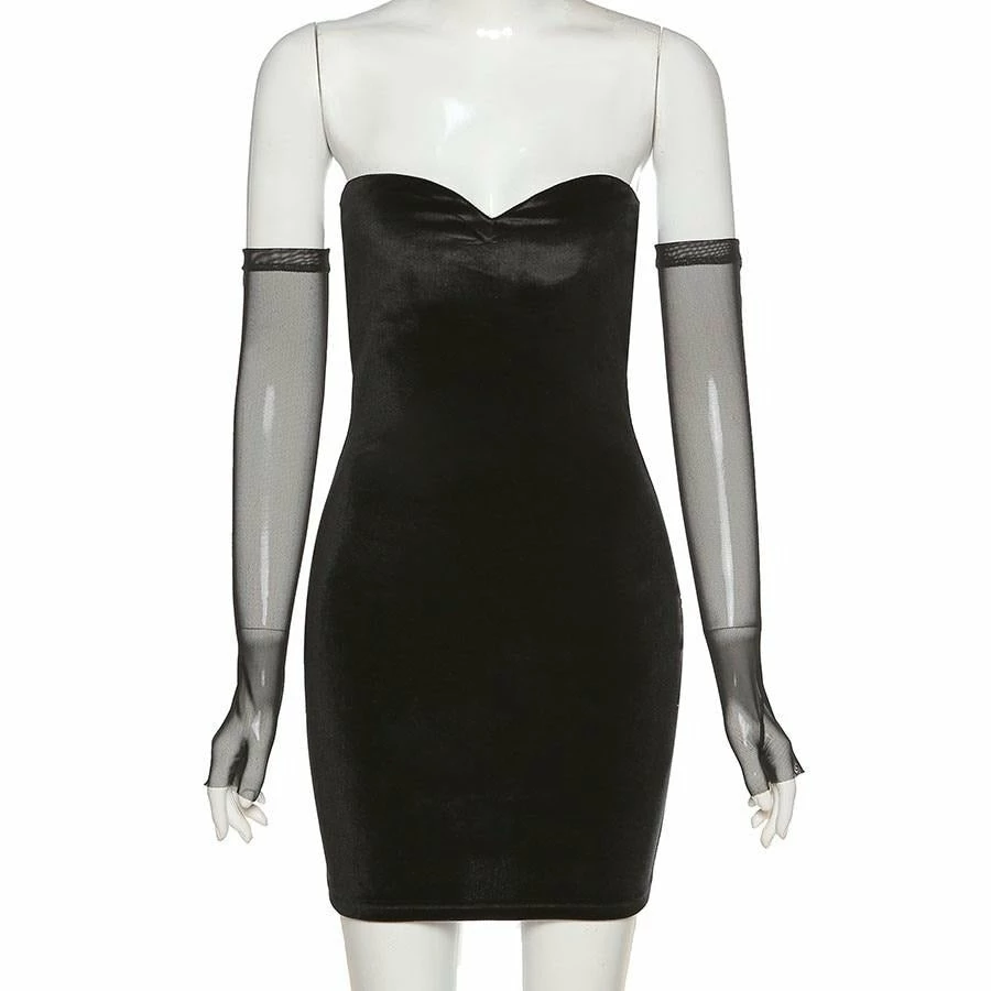 Black velvet strapless going out dress with mesh arm sleeves. Super elegant, and a little sexy.