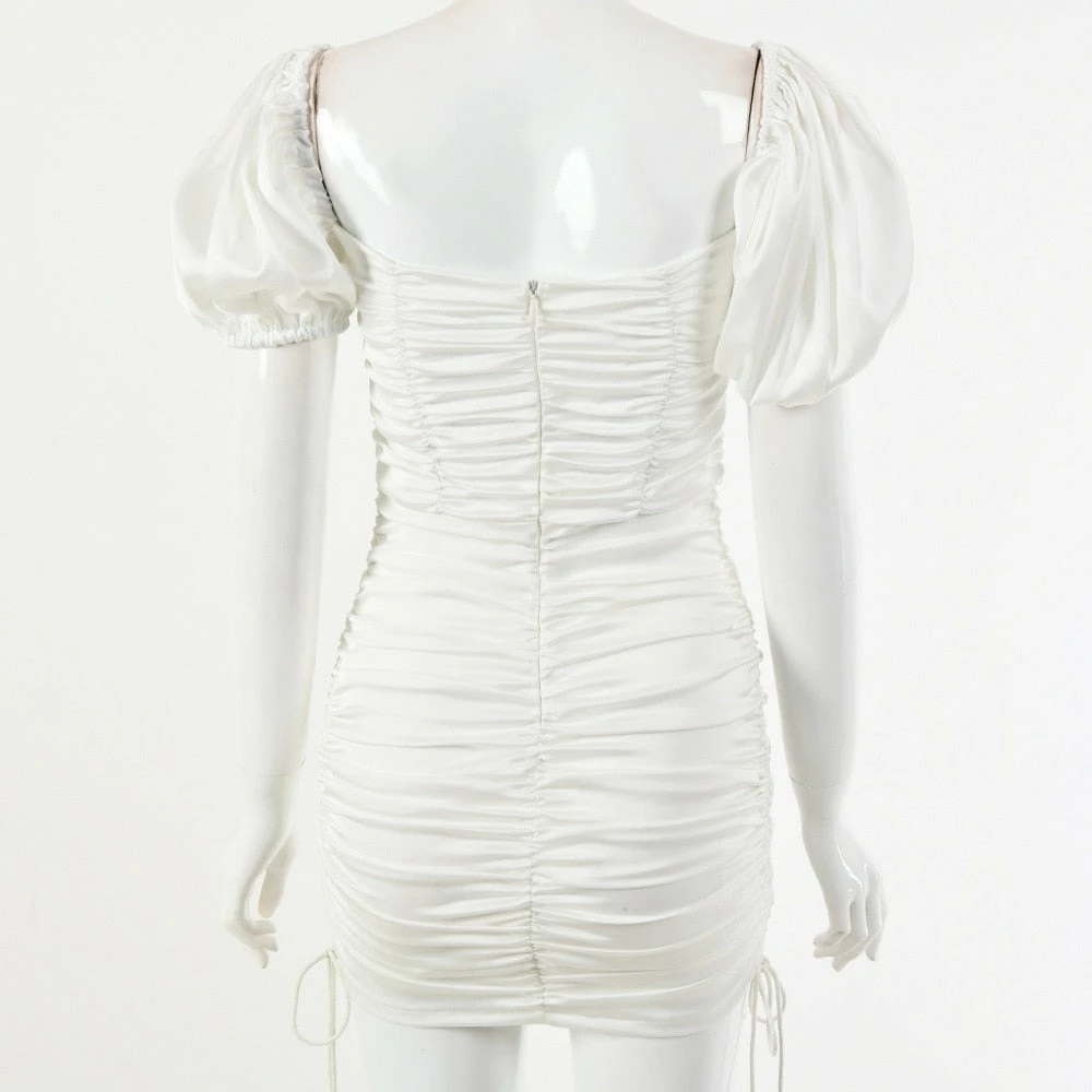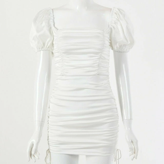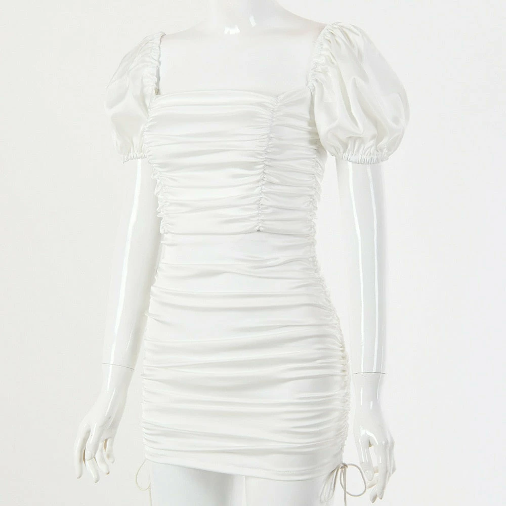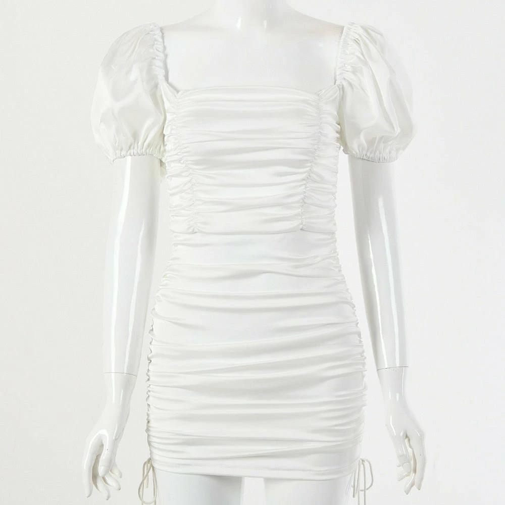 Mini sundress with square neck with scrunchie sleeves, and fitted bodice.