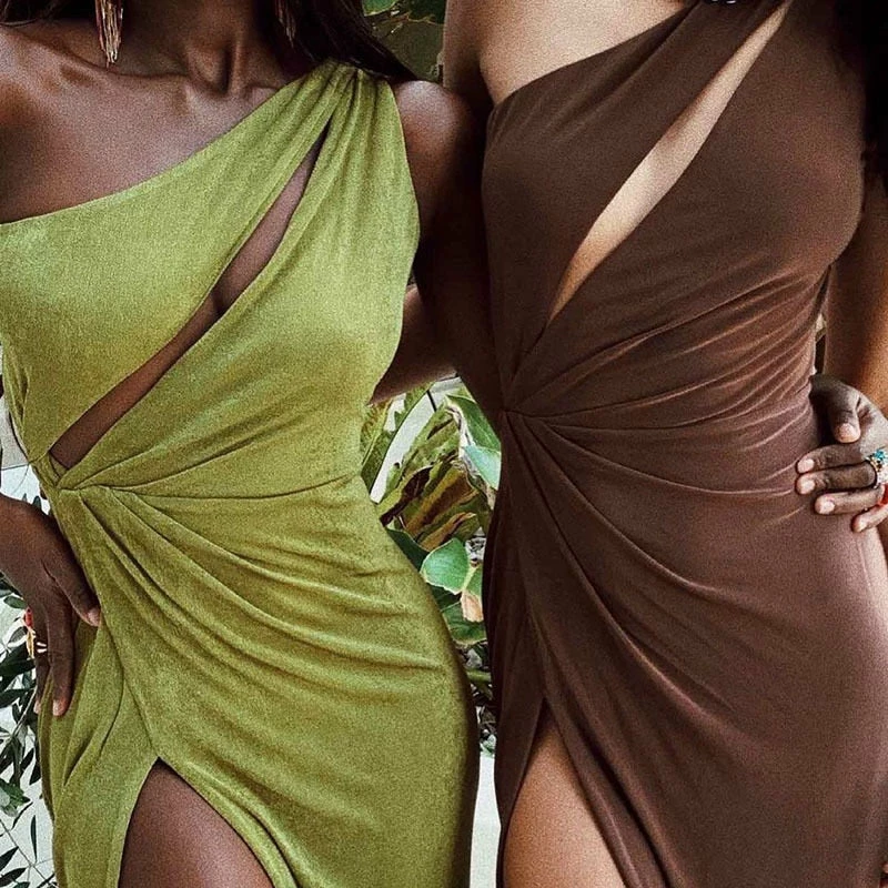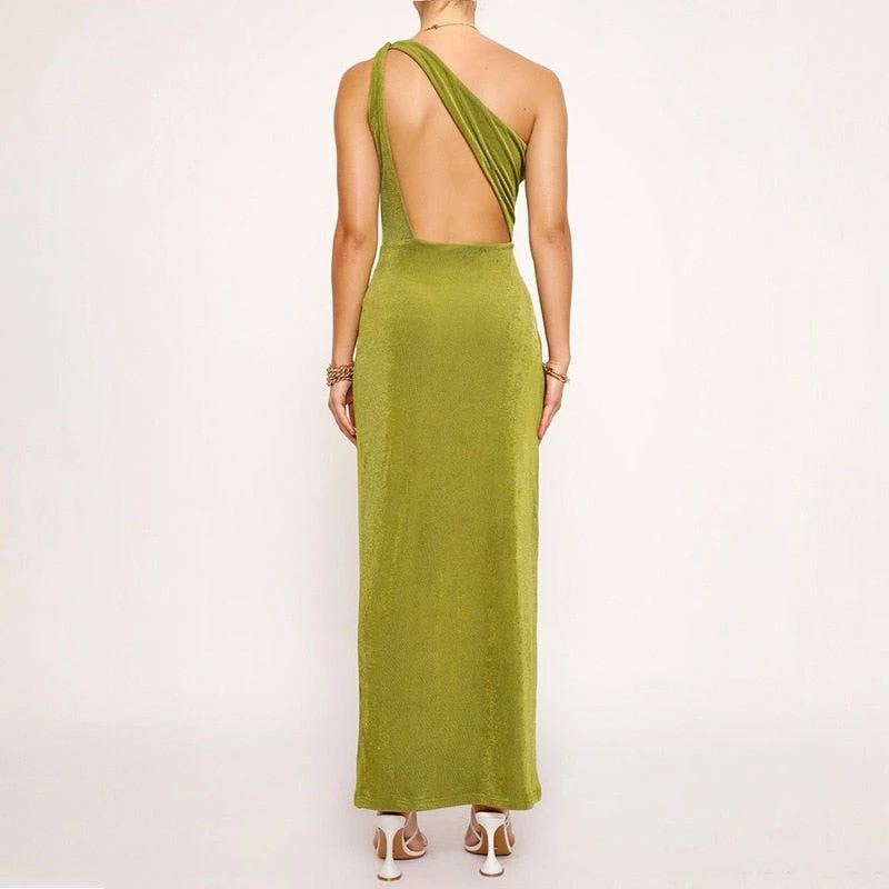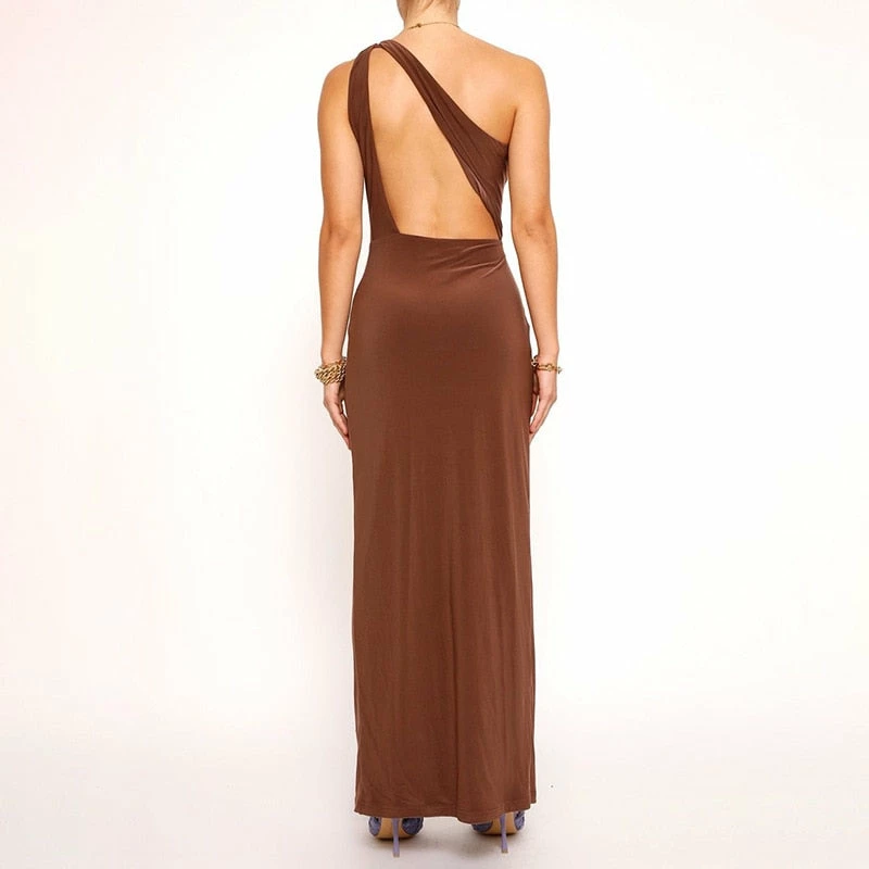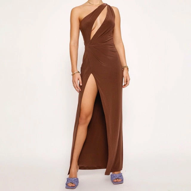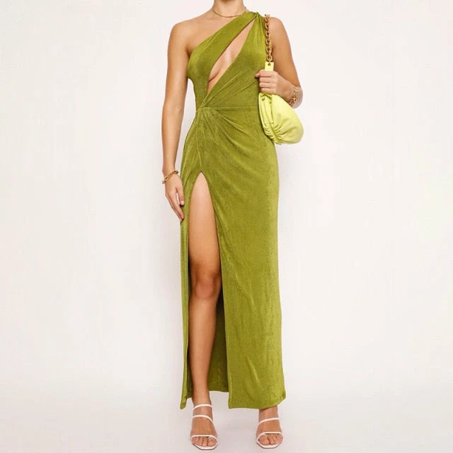 Long one shoulder dress with modest leg split. Extra sexy vibes.