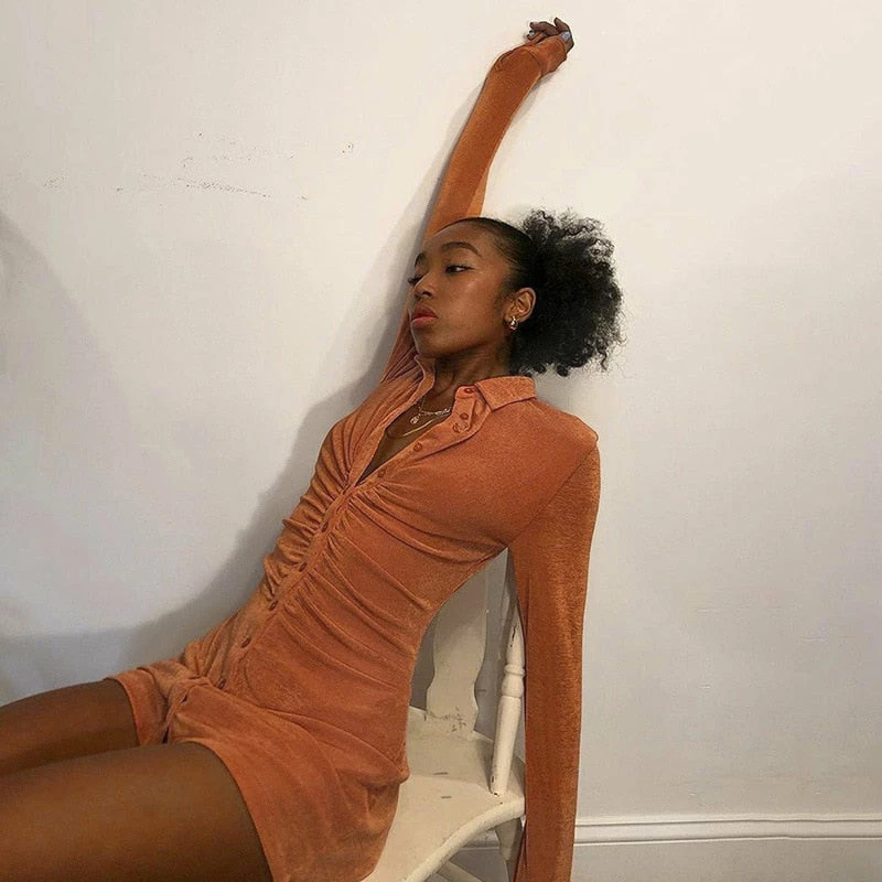 Long sleeve mini dress with a button up front, and collar.