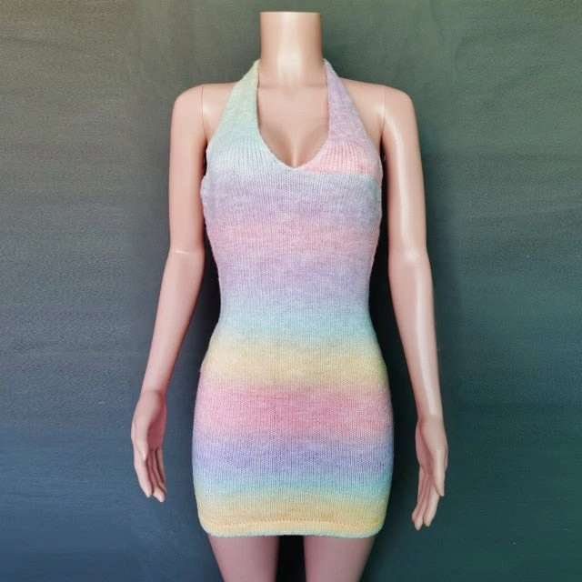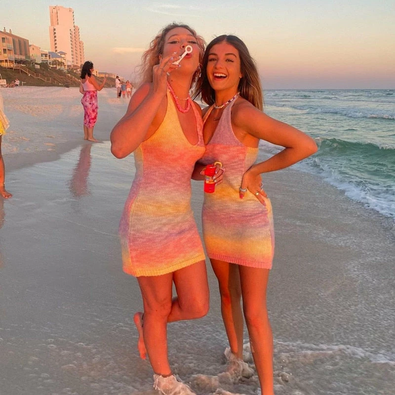 Mini knitted dress with a y2k tie dye design with an adjustable halter tie strap, and plunging v neck.