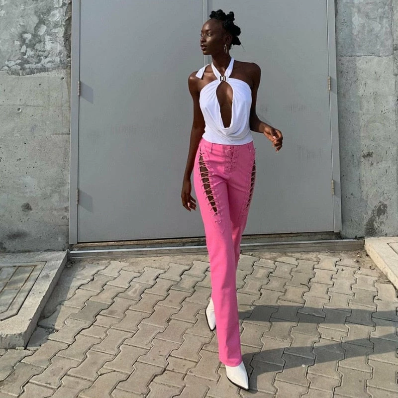 Faux vegan leather high waisted lace up leather pants with a straight leg fit.