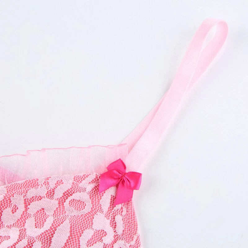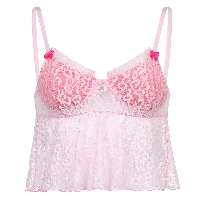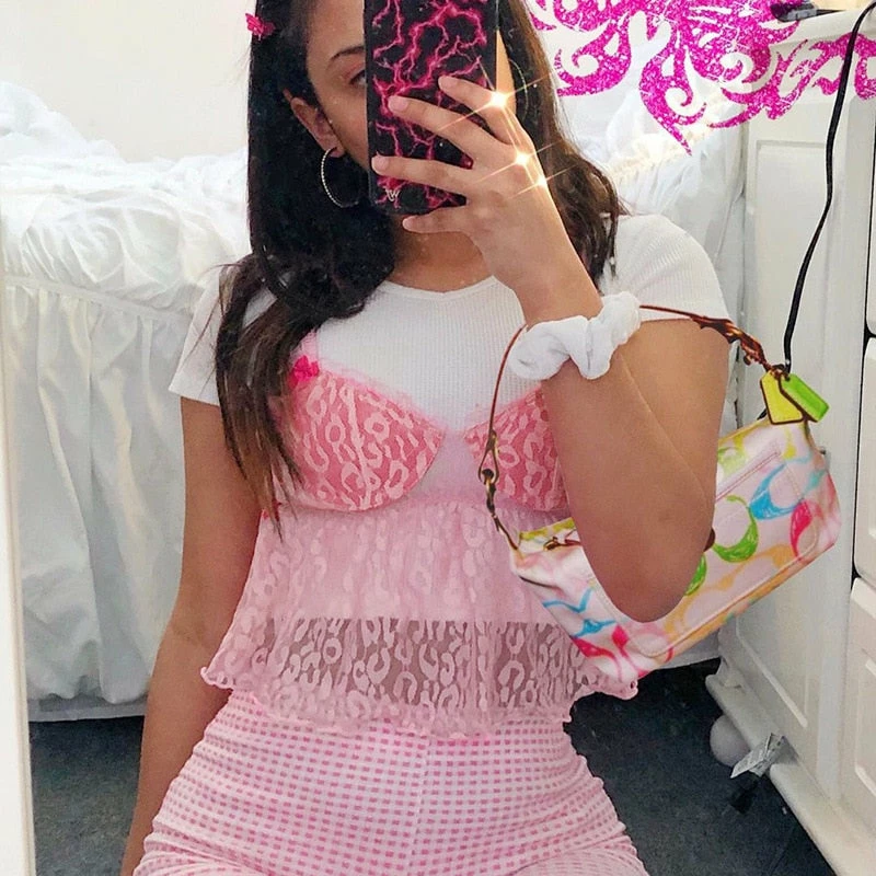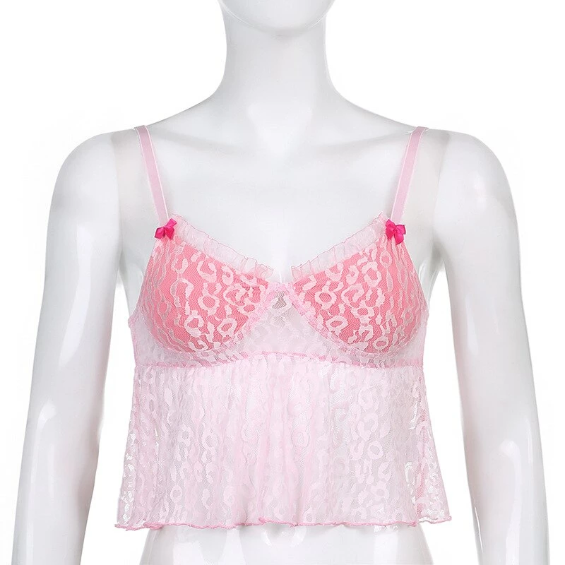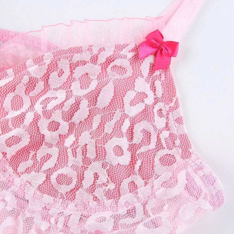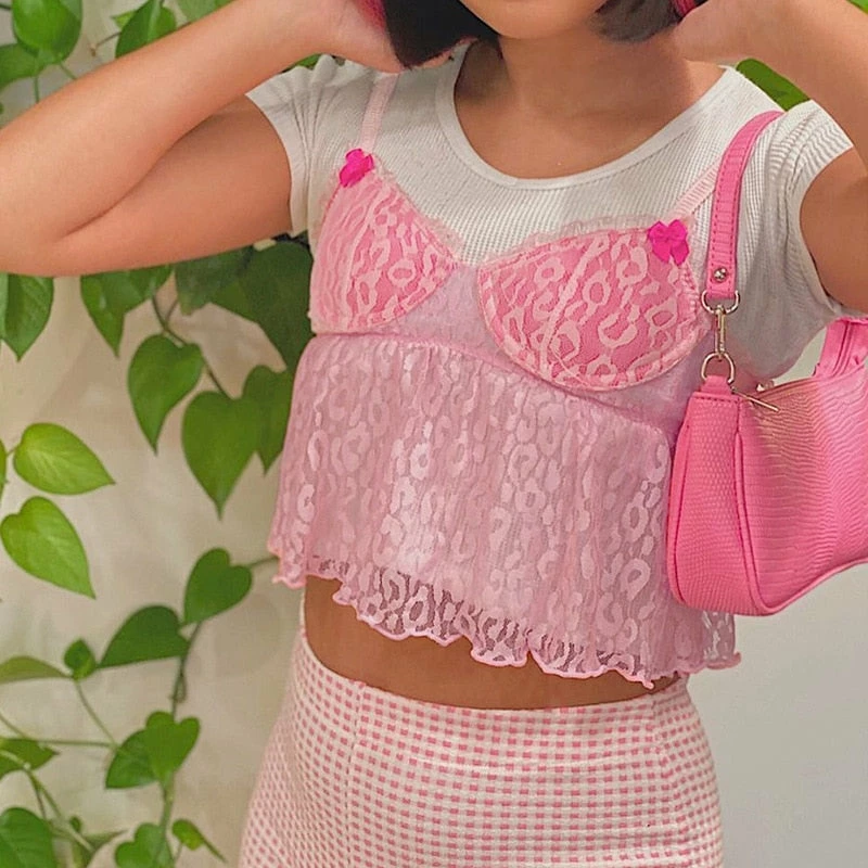 y2k pink leopard print cropped tank with lace detailing, and spaghetti straps. Model wears a size small.