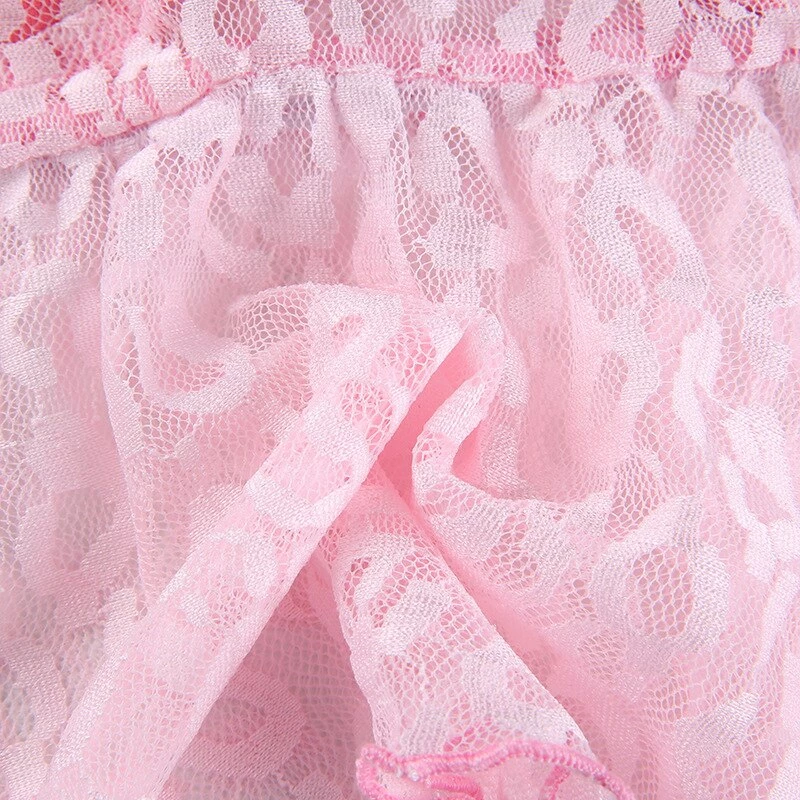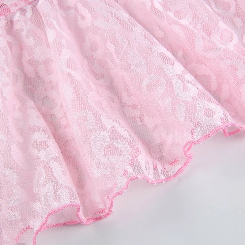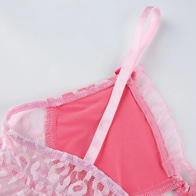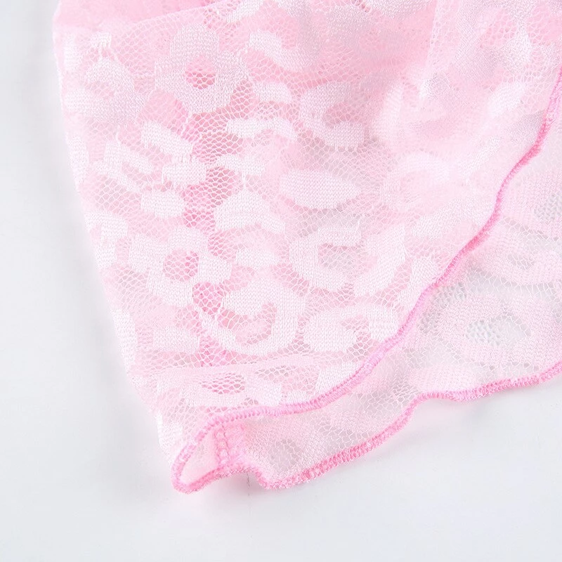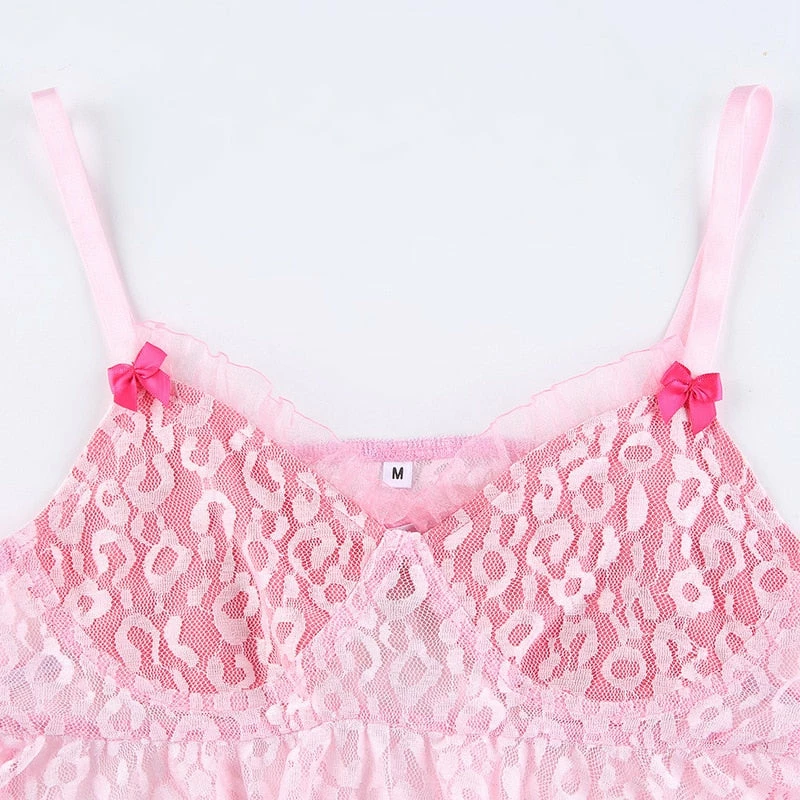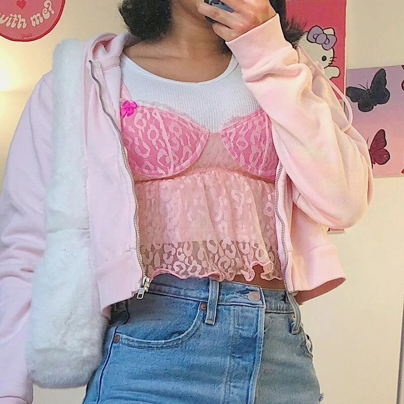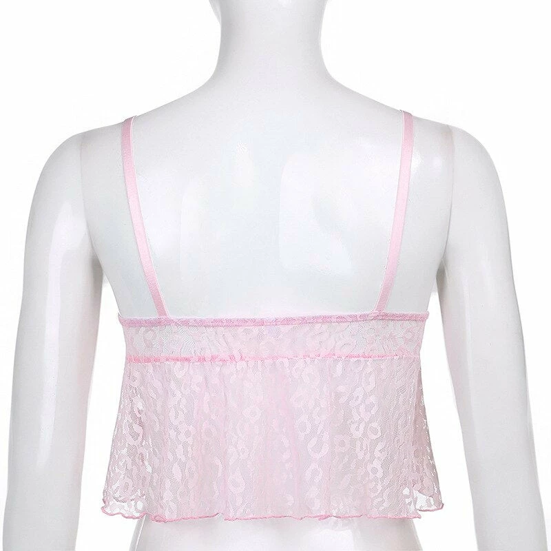 y2k pink leopard print cropped tank with lace detailing, and spaghetti straps. Model wears a size small.