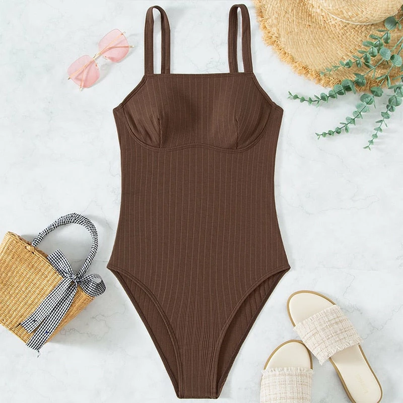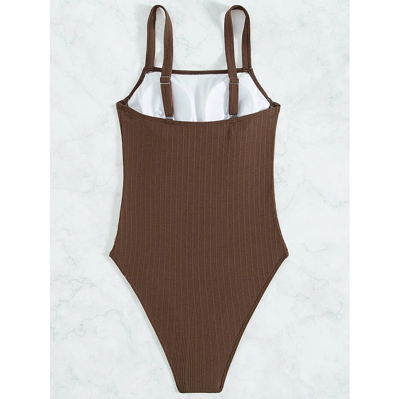 one piece mocha coffee color swimsuit. cheeky.