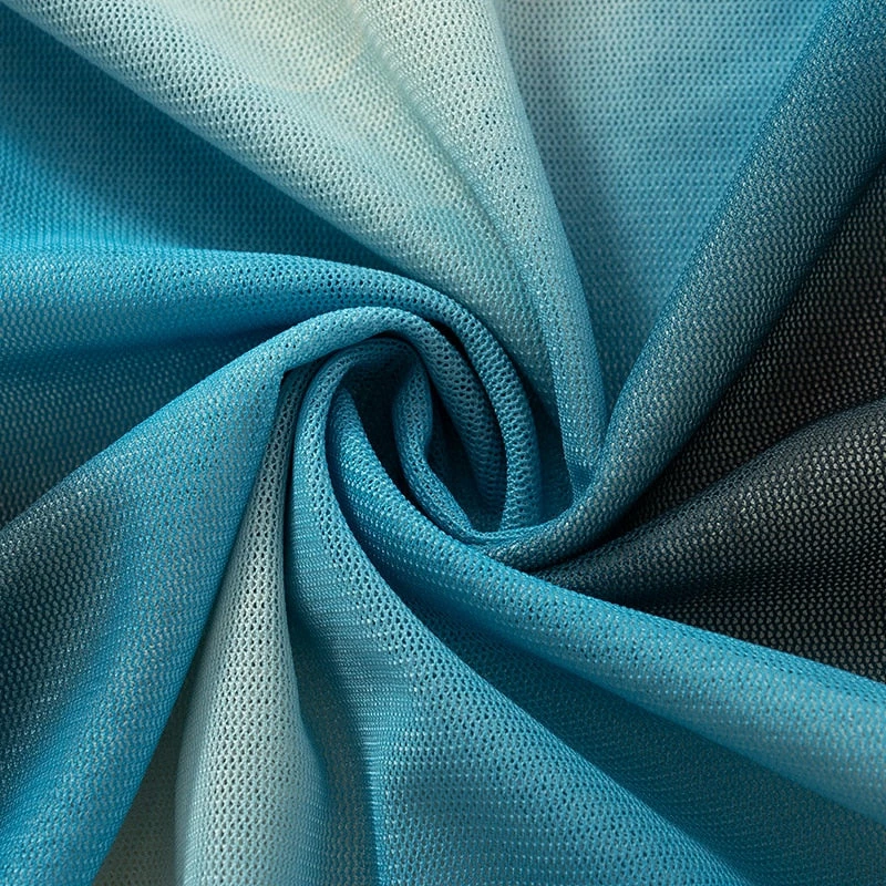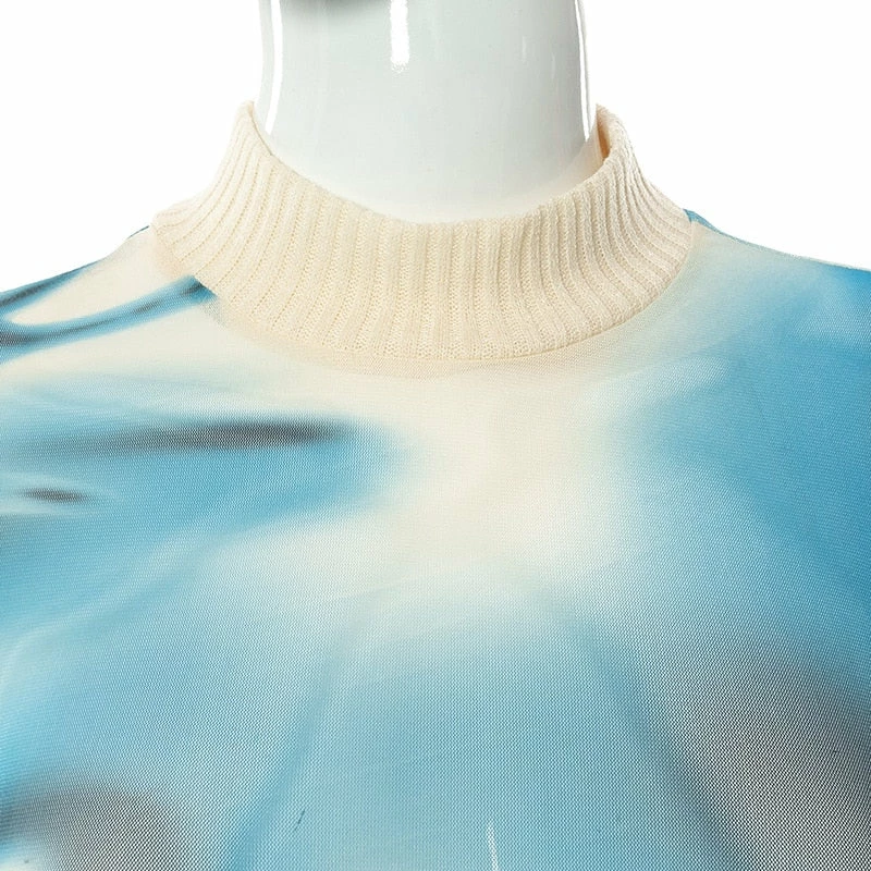 Cropped long sleeve with mesh style top with blue tie dye pattern