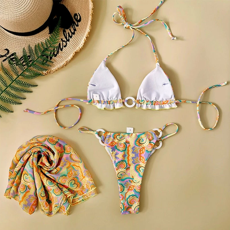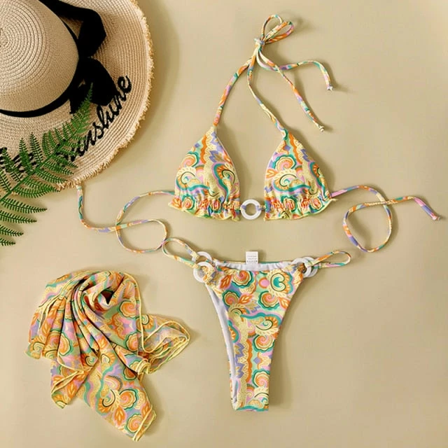 bikini includes the top, bottoms, & the coverup wrap. Low rise fit. Cheeky