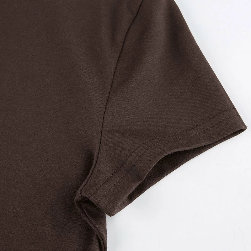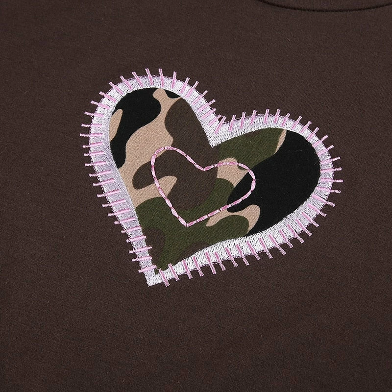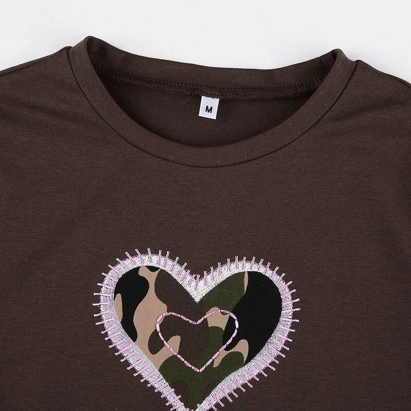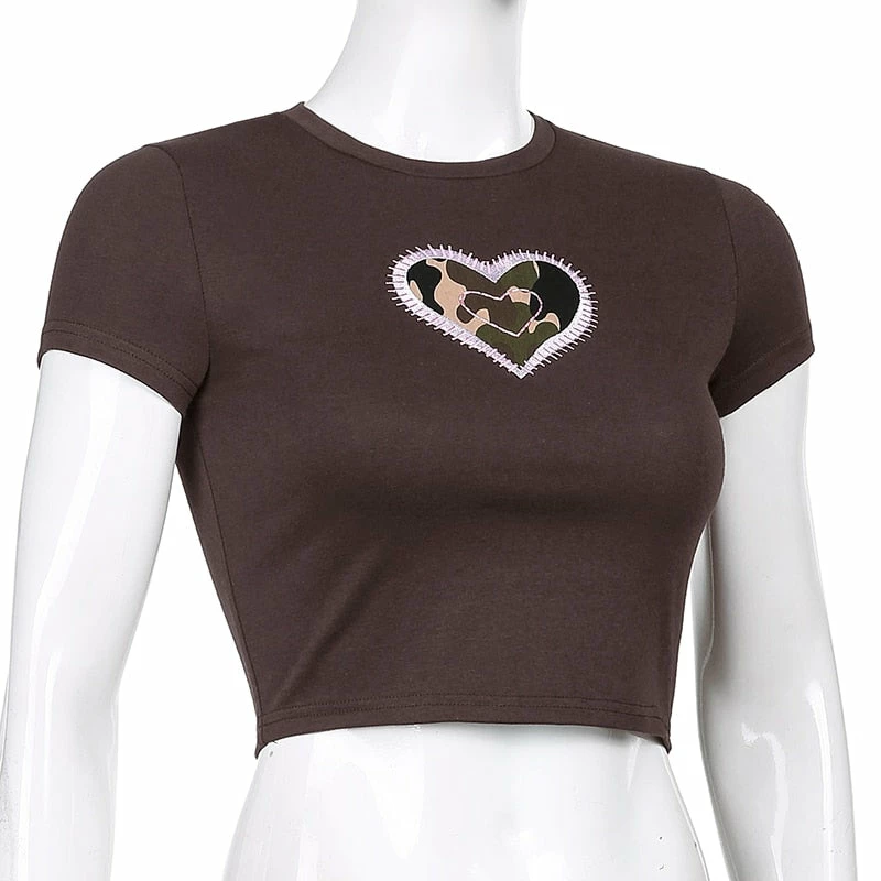 Y2K inspired short sleeve tee with contrast stitching heart design, and a cropped fit.