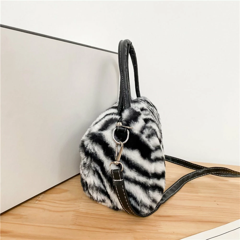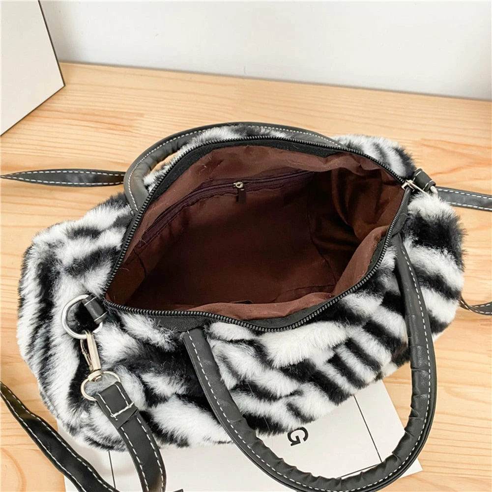 fuzzy fur hand bag with faux vegan leather straps, and removable crossbody strap