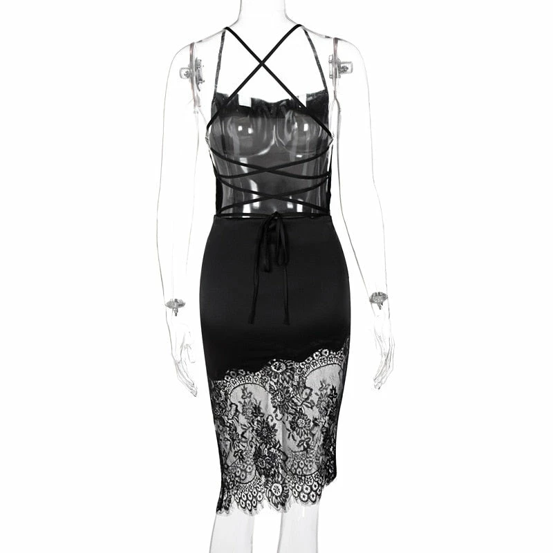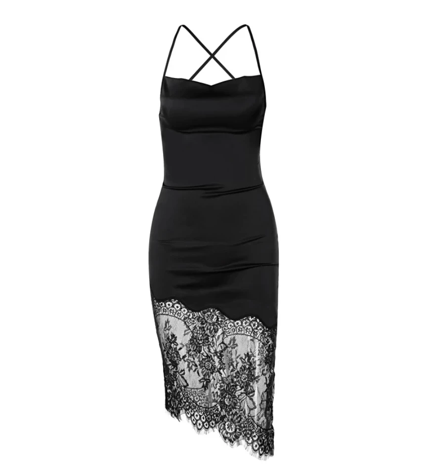 Black cami slip dress with black lace detailing and spaghetti straps.