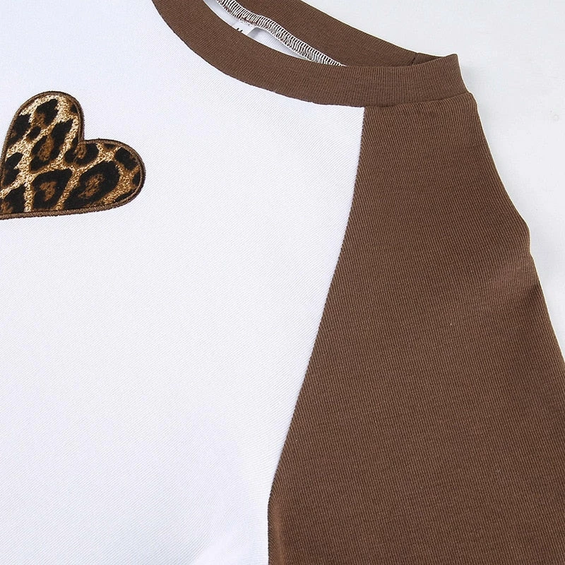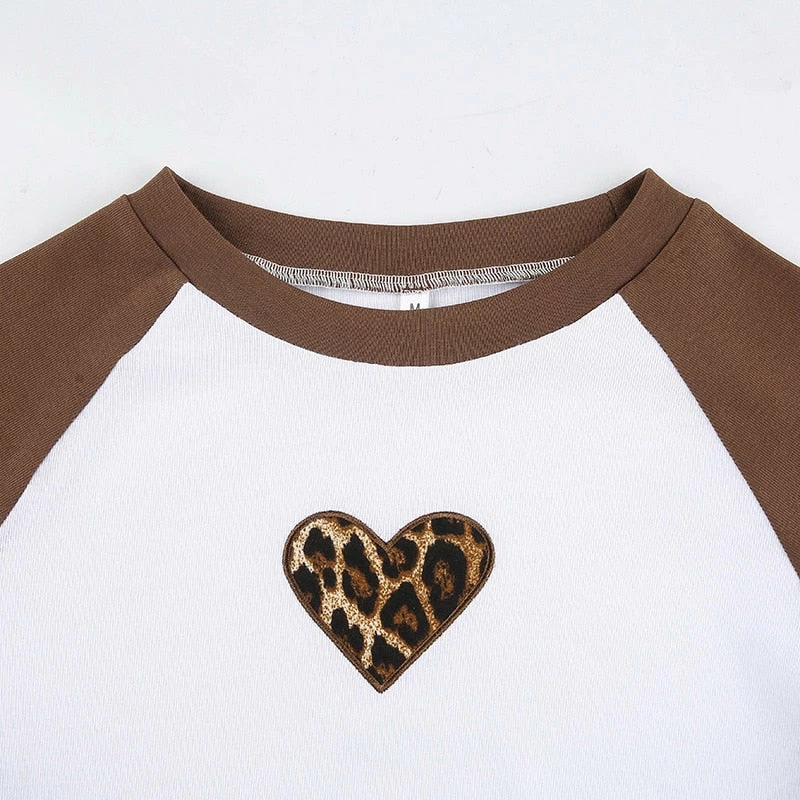 Brown long sleeve thermal with long sleeves and a leopard print heart.