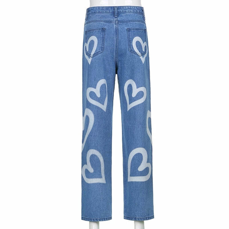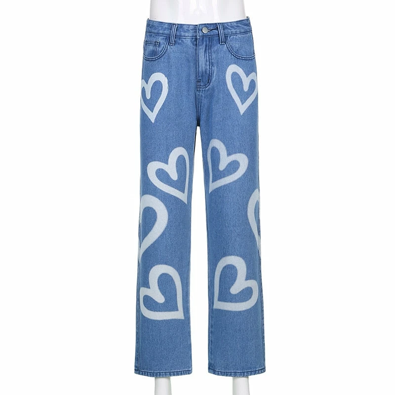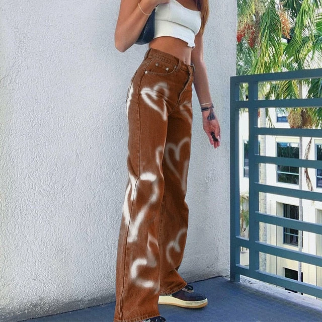 High-waisted jeans with an all-over graffiti design, belt loops, and side pockets.