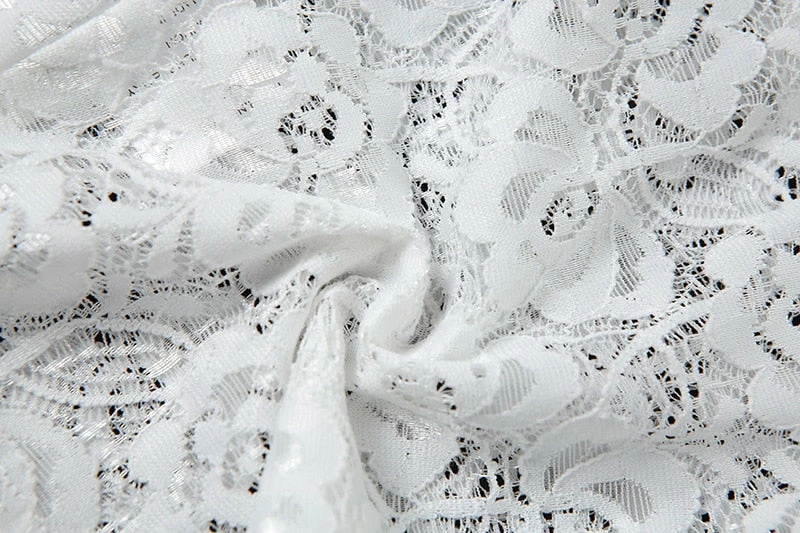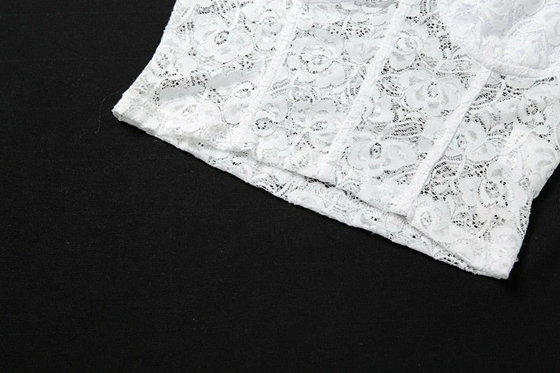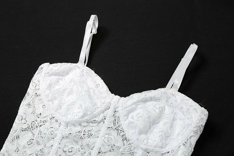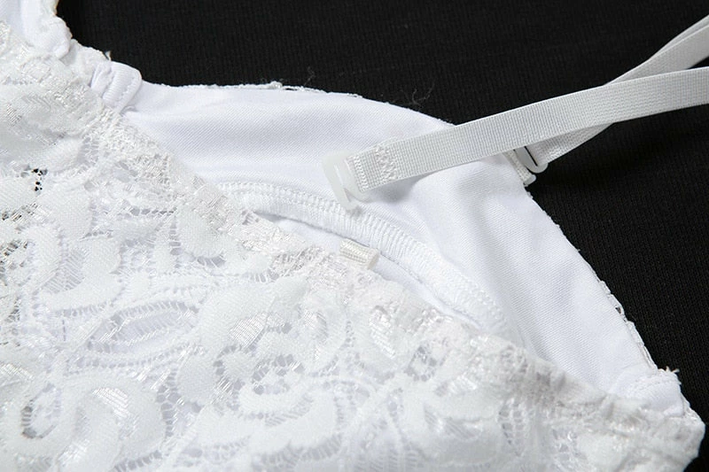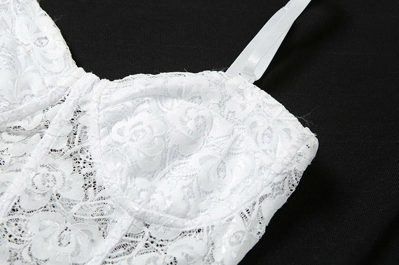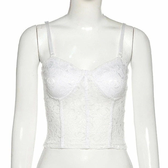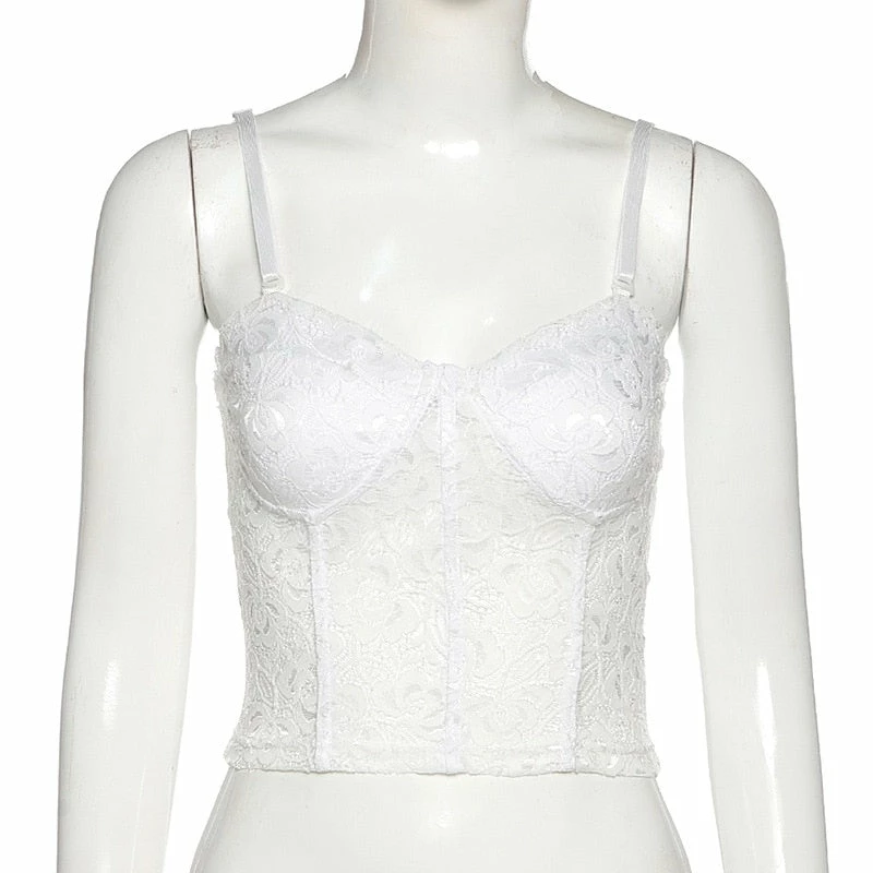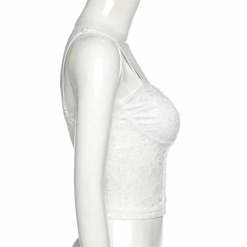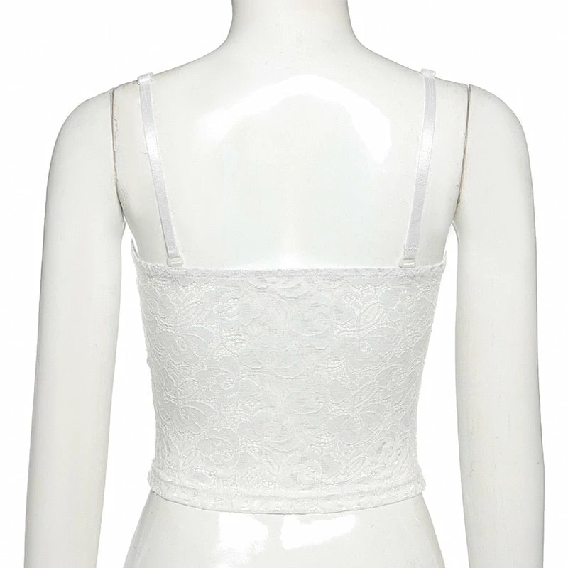 Cropped fit spaghetti strap tank top in white with lace detailing